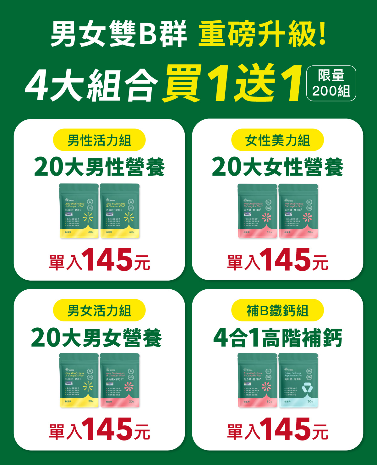 歡慶男女酵母B群升級回歸!獻上買1送1超殺4種組合,5日快閃只到12/15的23:59,限量200組售完不補,敬請把握難得機會!可透過以下按鈕進入選購,想深入認識產品,邀請您繼續往下閱讀。