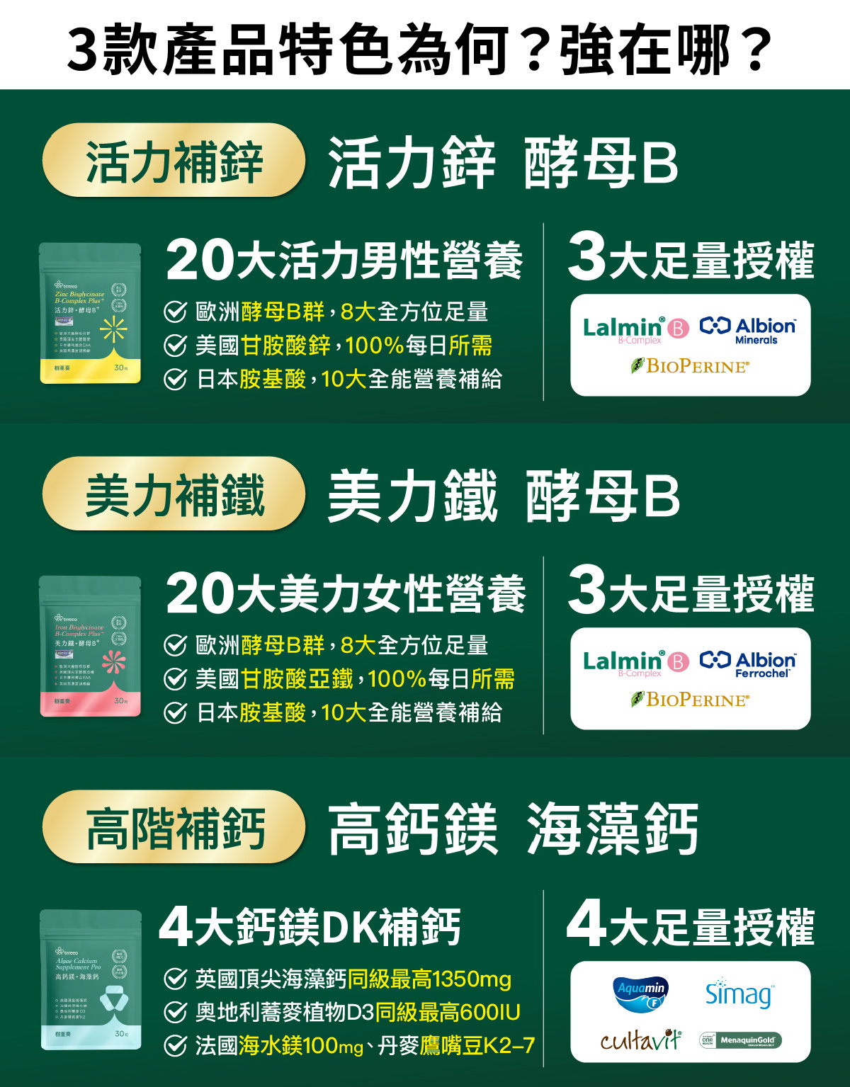我們選用高濃度、高吸收率、高科學信賴的美國Albion甘胺酸系列礦物質。沒錯,就是那個你常常看到吸收率超高的甘胺酸亞鐵、甘胺酸鋅。補鐵、鋅不用吃一堆,這1粒就讓你100%達標!