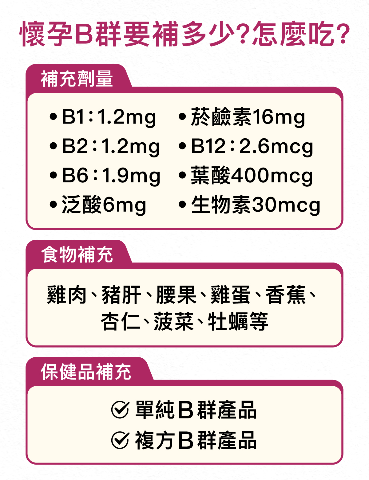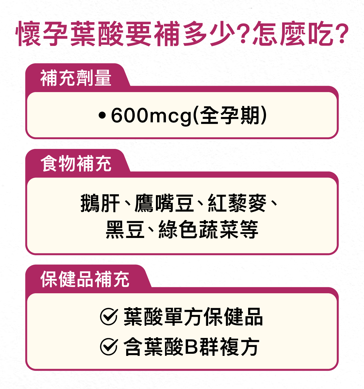 若單靠食物擔心攝取不足,建議可透過單方葉酸保健品,或含有葉酸的B群複方產品補充。