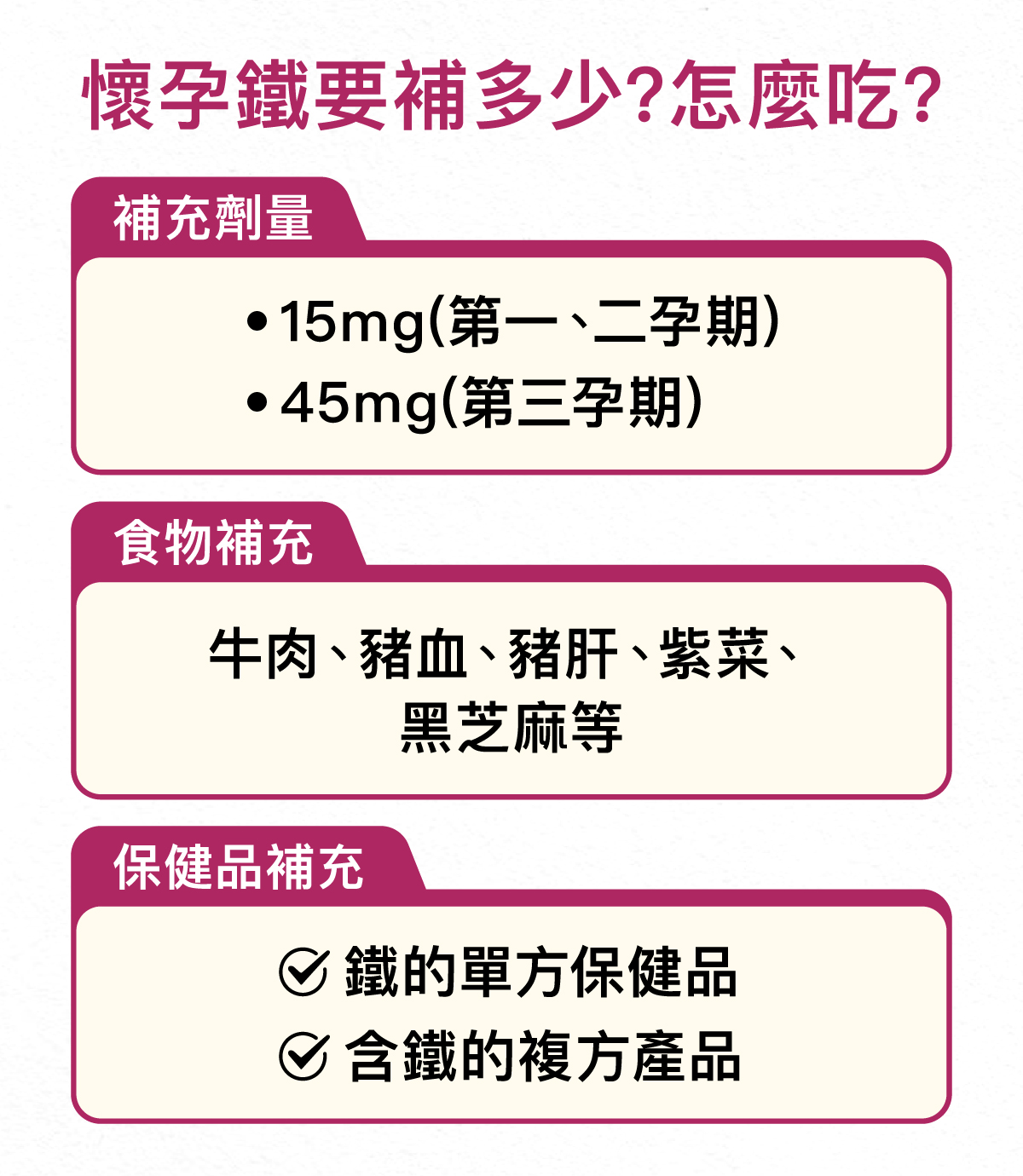 若單靠食物擔心攝取不足,建議可透過單方補鐵保健品,或含有鐵的複方產品補充。