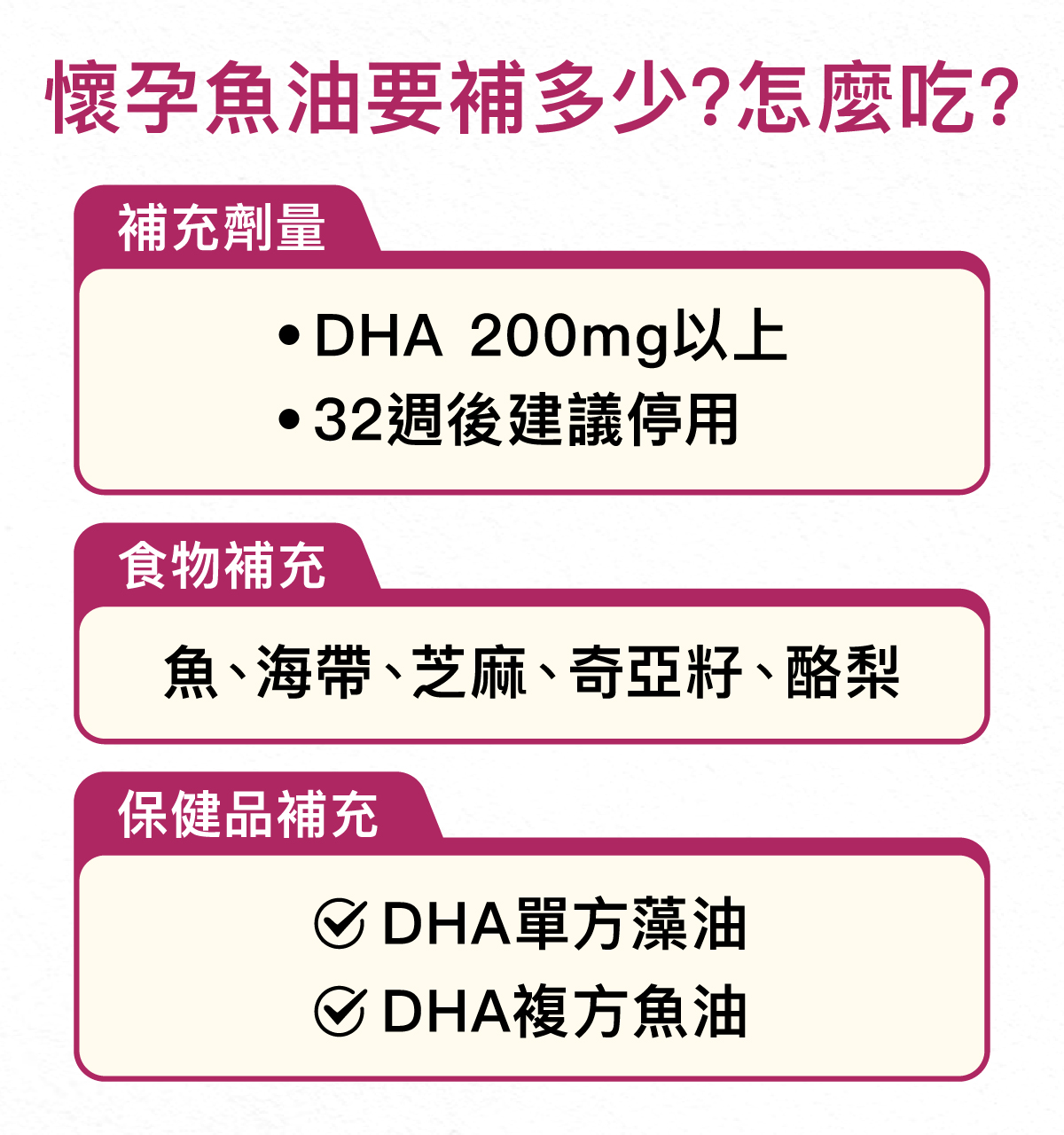 魚油主要攝取Omega-3內的DHA和EPA,孕期建議每天至少攝取200mg以上的DHA,有助調整體質、健康維持。