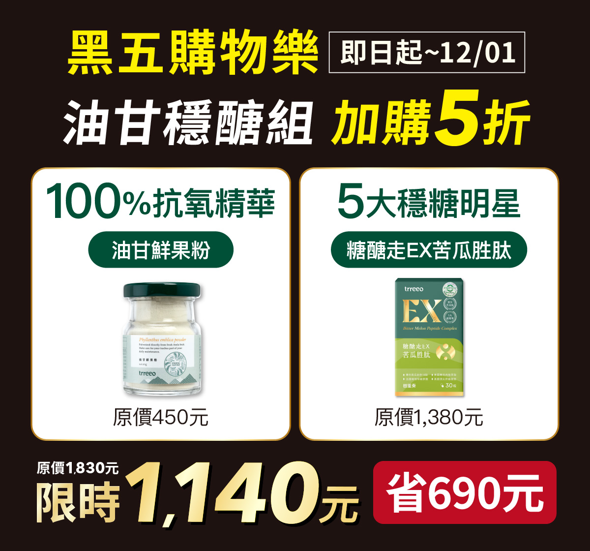 如果您對這款苦瓜胜肽有興趣,千萬不要錯過12/01前的黑五購物樂,買100%抗氧精華的油甘鮮果粉,即可用5折的價格搭配這款高規苦瓜胜肽。原料1,830元,現在只要1,140元,就可帶走兩款熱銷商品,只有200組,敬請把握!