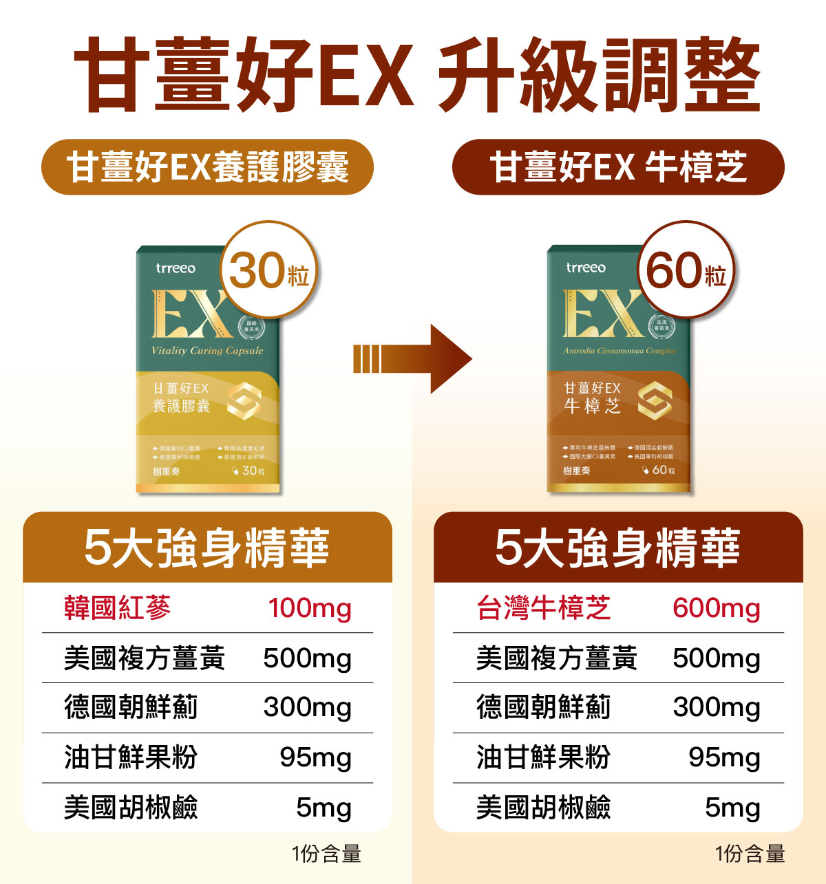 前一代的「甘薑好EX」以美國C3薑黃、韓國紅蔘、德國朝鮮薊3者為主料,皆添加至授權足量,搭配美國胡椒鹼、台灣油甘鮮果粉,共5大原料加滿兩粒膠囊,達到100%全有效成分充填。