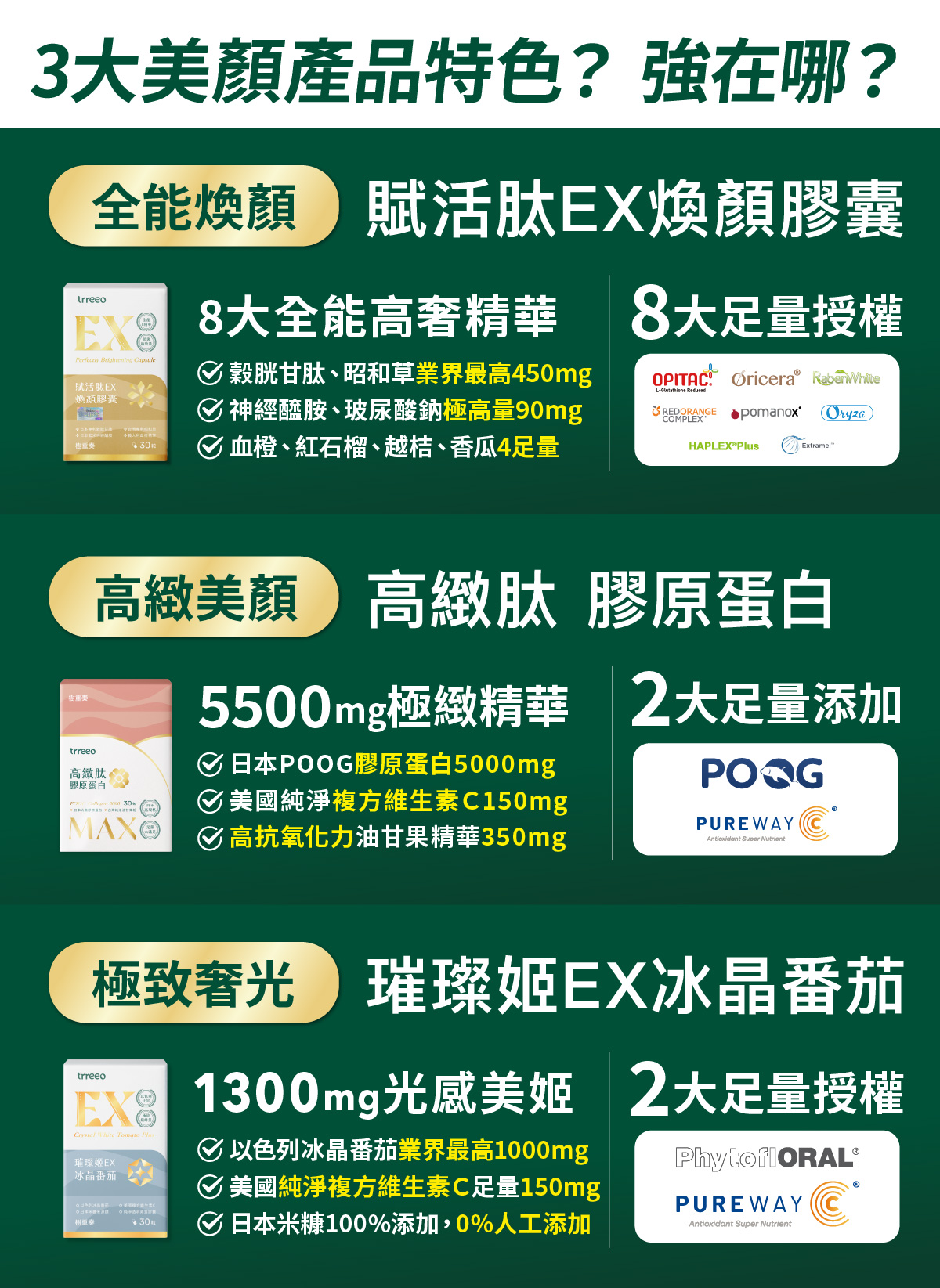 樹重奏有三款美顏產品,根據三種不同的需求開發。第一、如果您追求奢光美顏,那可以選璀璨姬EX冰晶番茄。第二、如果您追求高緻青春美麗,那可以選高緻肽MAX膠原蛋白。第三、如果您追求全能煥顏,那一定要選賦活肽EX煥顏膠囊。
