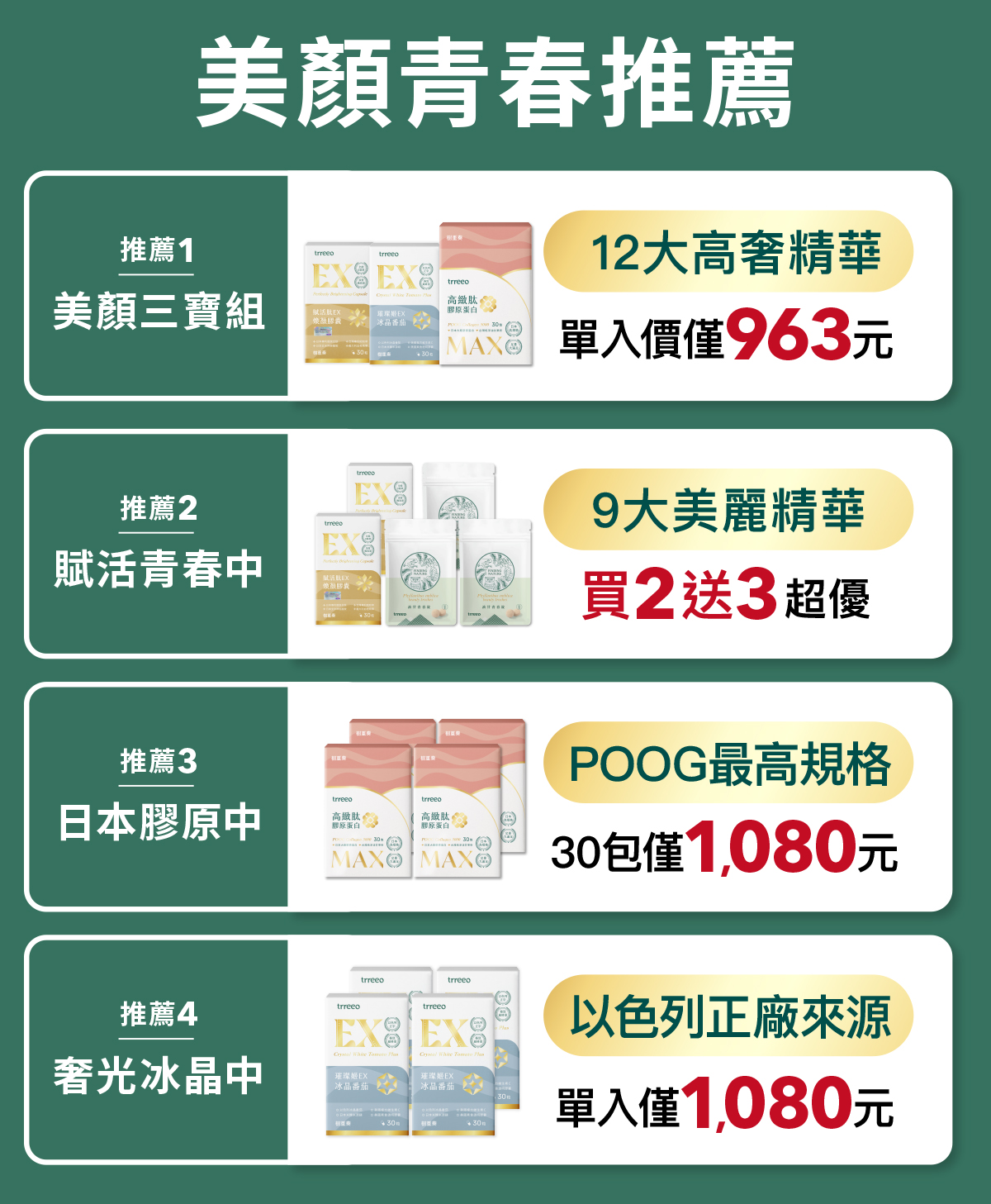 如果你是第一次接觸、想一次補齊全能美顏需求,我們特別為新朋友規劃了【美顏三寶體驗組】膠原蛋白 × 冰晶番茄 × 賦活肽,單入體驗價 963 元,幫助你輕鬆美麗、一次到位。
