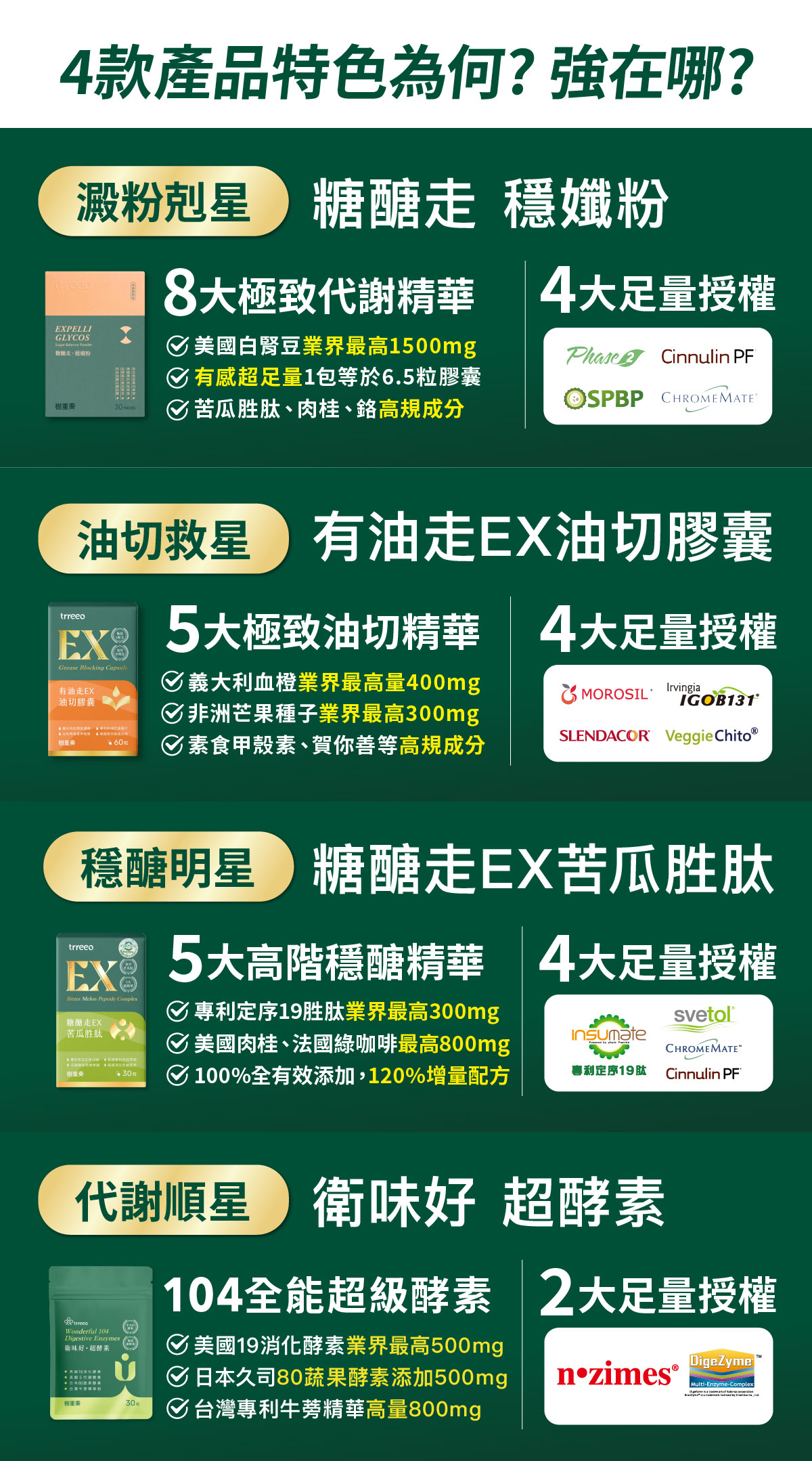 樹重奏代謝4大天王,針對您的4種不同需求,提供4款強而有力配方的產品,配方皆為業界之最!4款皆為熱銷品,數量有限敬請把握機會!(目前糖醣走穩孅粉已熱銷一空)