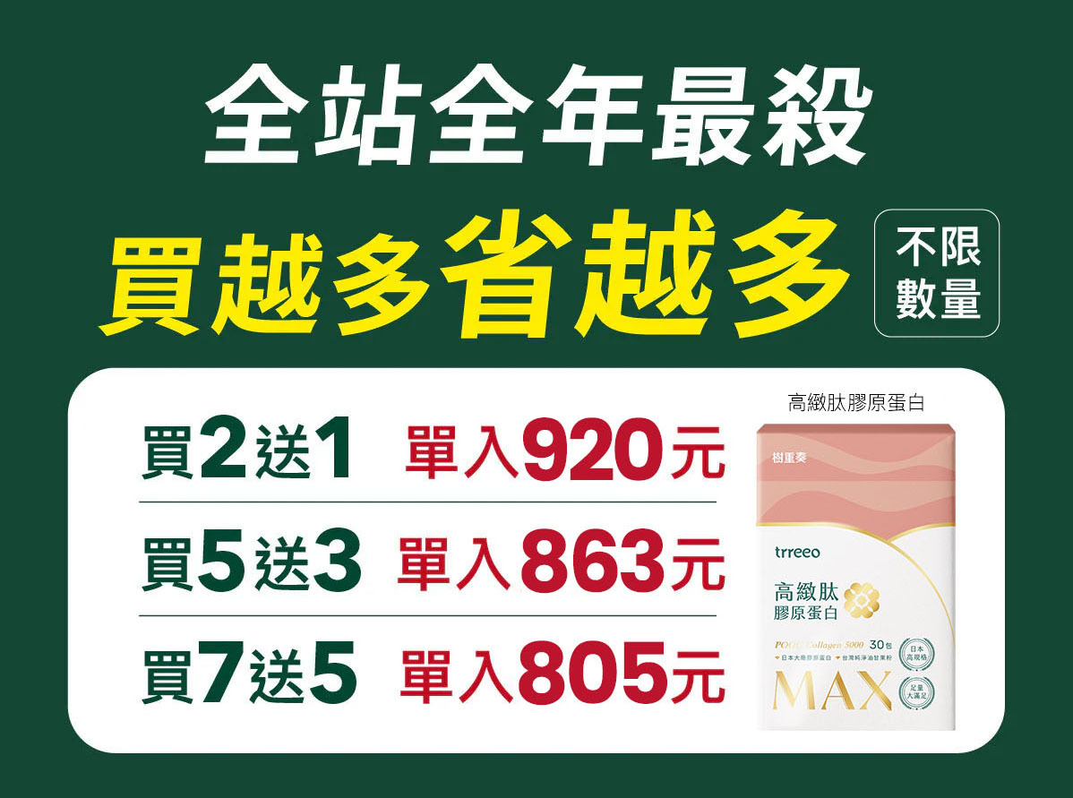 樹重奏針對您想追求高緻有感、無腥臭味負擔的美麗需求,提供日本POOG最高規的膠原蛋白複方,並用805元起,買2送1、買5送3、買7送5的全年最殺價格回饋給您!挺您青春美麗、養顏美容、馬上漂亮!想暸解更多優惠內容,請往下看!