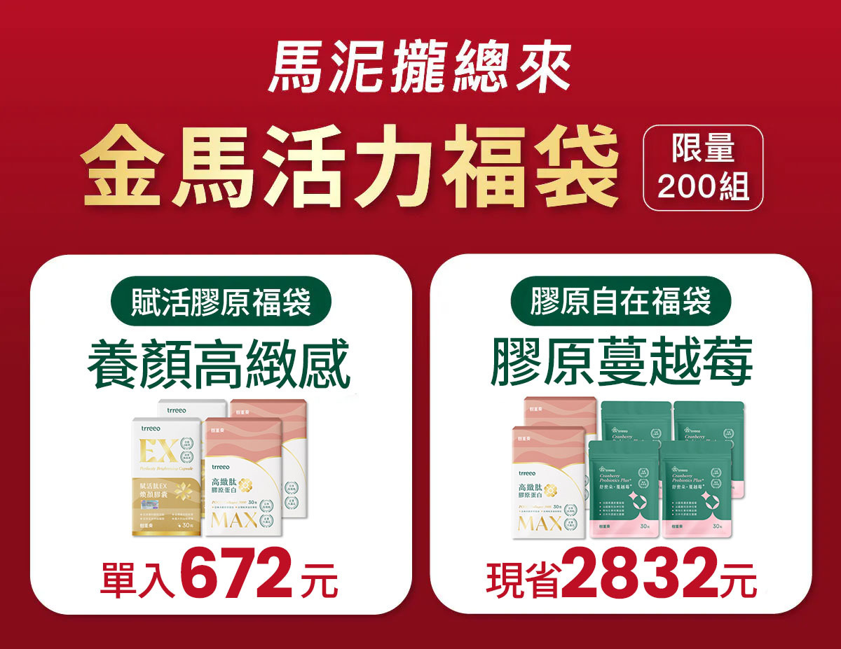 新的一年追求極致美麗,樹重奏現在還有超划算的金馬福袋,單入僅672元!您一定要把握下面兩組福袋,分別是高緻膠原蛋白,搭配賦活肽EX煥顏膠囊與82mg原花青素蔓越莓的金馬福袋組合,有兩款: