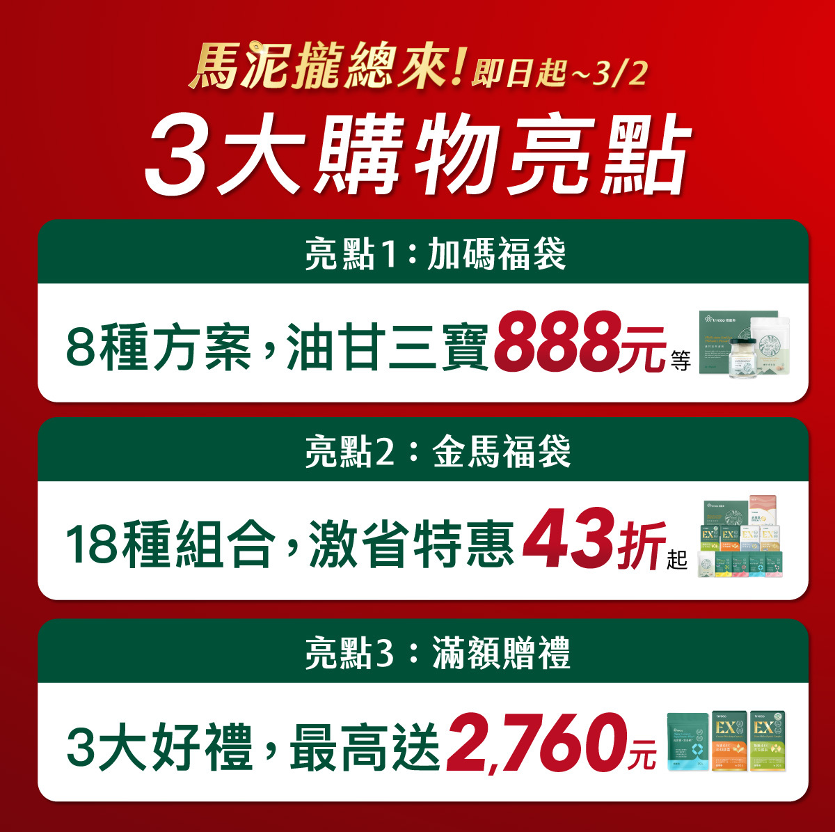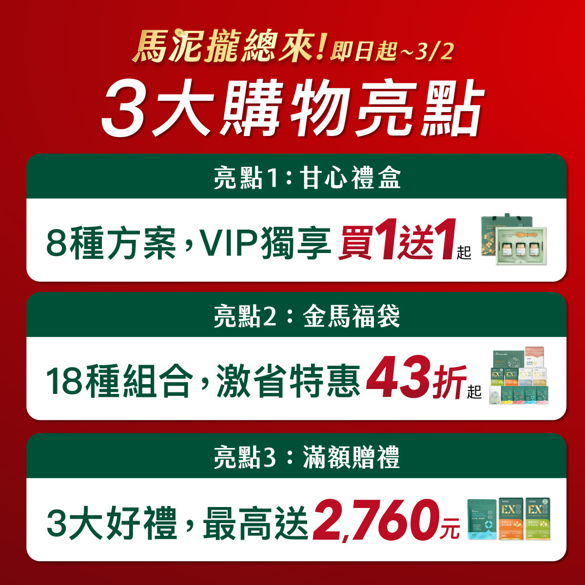「馬泥攏總來」新春活動,獻上全站商品最殺特惠!讓您可以省荷包開心買外,擁有更好的健康狀態,才能馬力全開、一馬當先、馬到成功、馬泥攏總來!