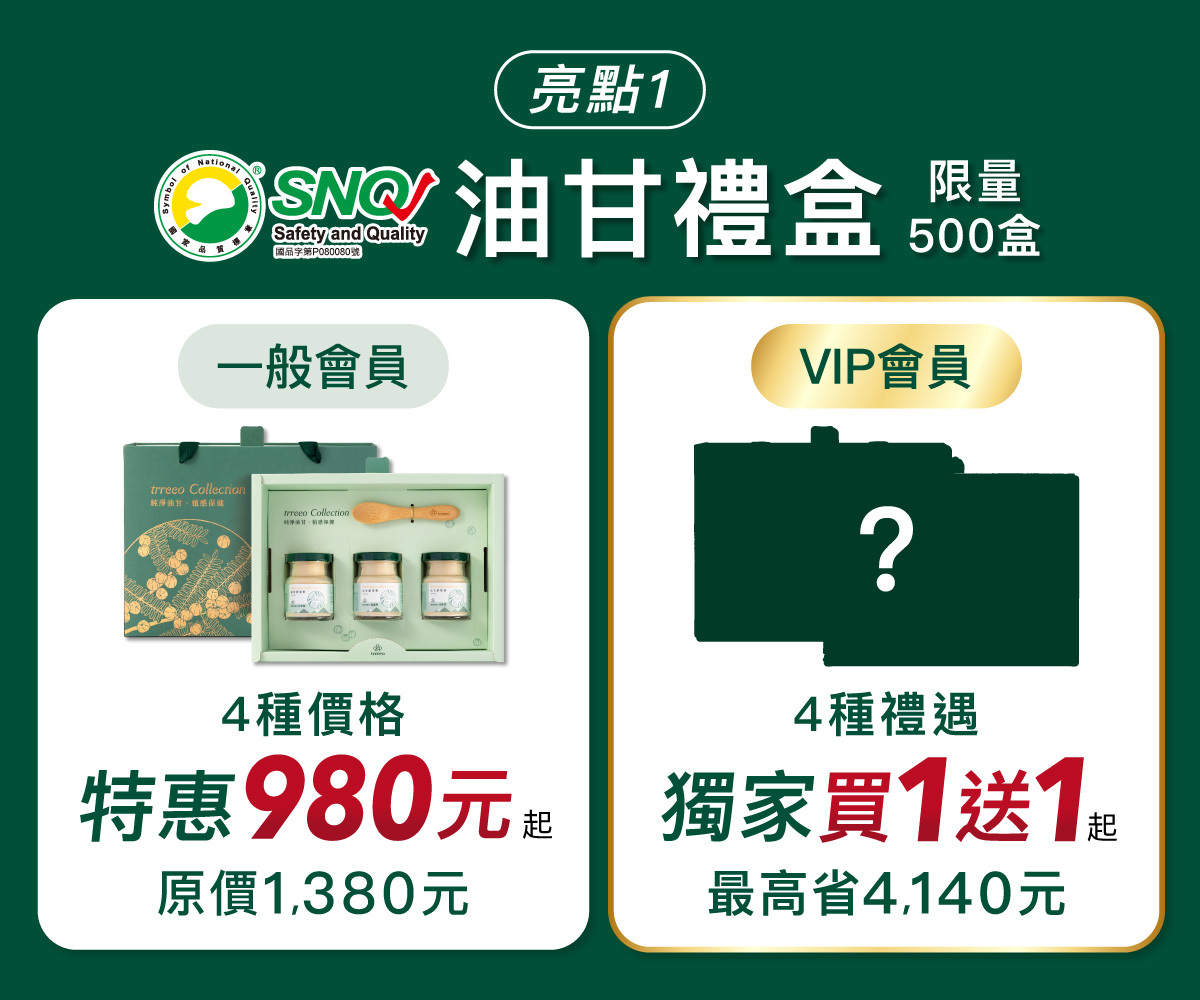 送禮送健康,這款內外兼具的油甘甘心禮盒超適合!8種購買選擇,VIP獨家價買1送1,限量500盒,錯過不再有!