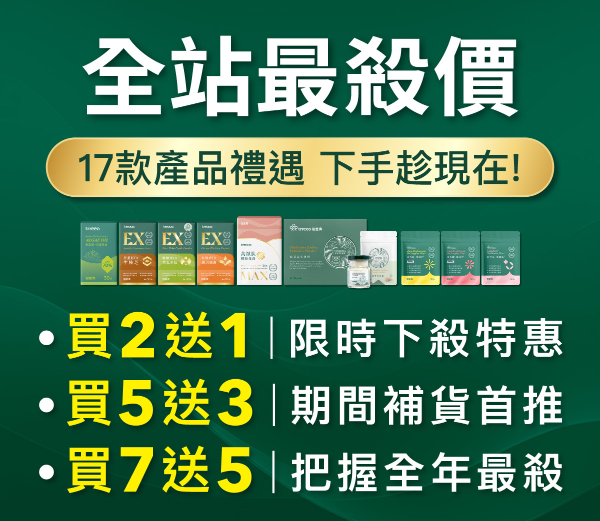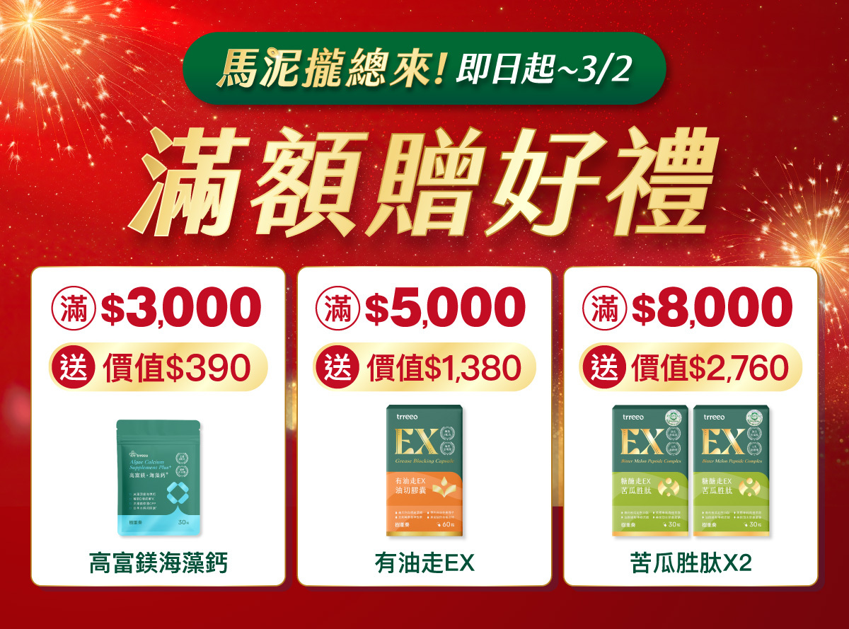 即日起只要購物滿3000元起,就送你海藻鈣、油切救星、苦瓜胜肽,最高2,760元的好禮!數量有限敬請把握!