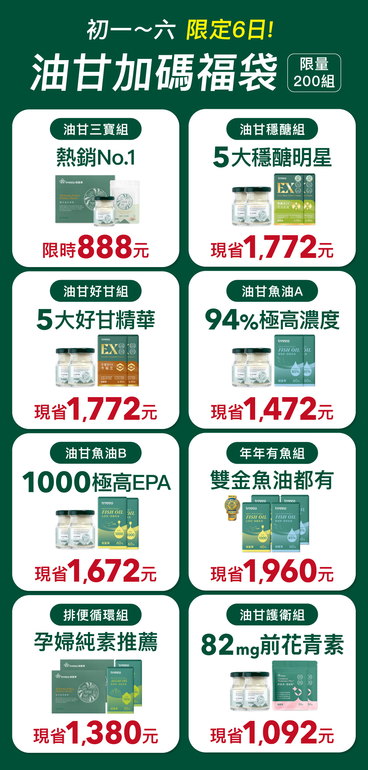 過年挺大家健康!為各位獻上加碼8款超殺福袋,有大家超愛的油甘三寶888元讓您健康發發發!還有苦瓜胜肽、牛樟芝、三款魚藻油、蔓越莓低至49折,真的超好買!