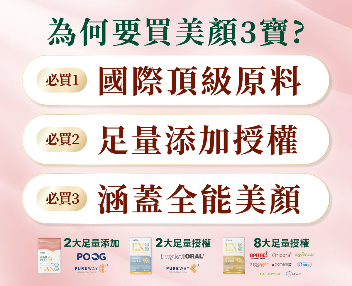因為樹重奏熟悉原料,知道這3點,所以美顏三寶,擁有多達12項國際頂級原料的「足量授權」,更有多項達到「業界最高」,如果您追求更有感的美顏產品,一定要認識一下它們!
