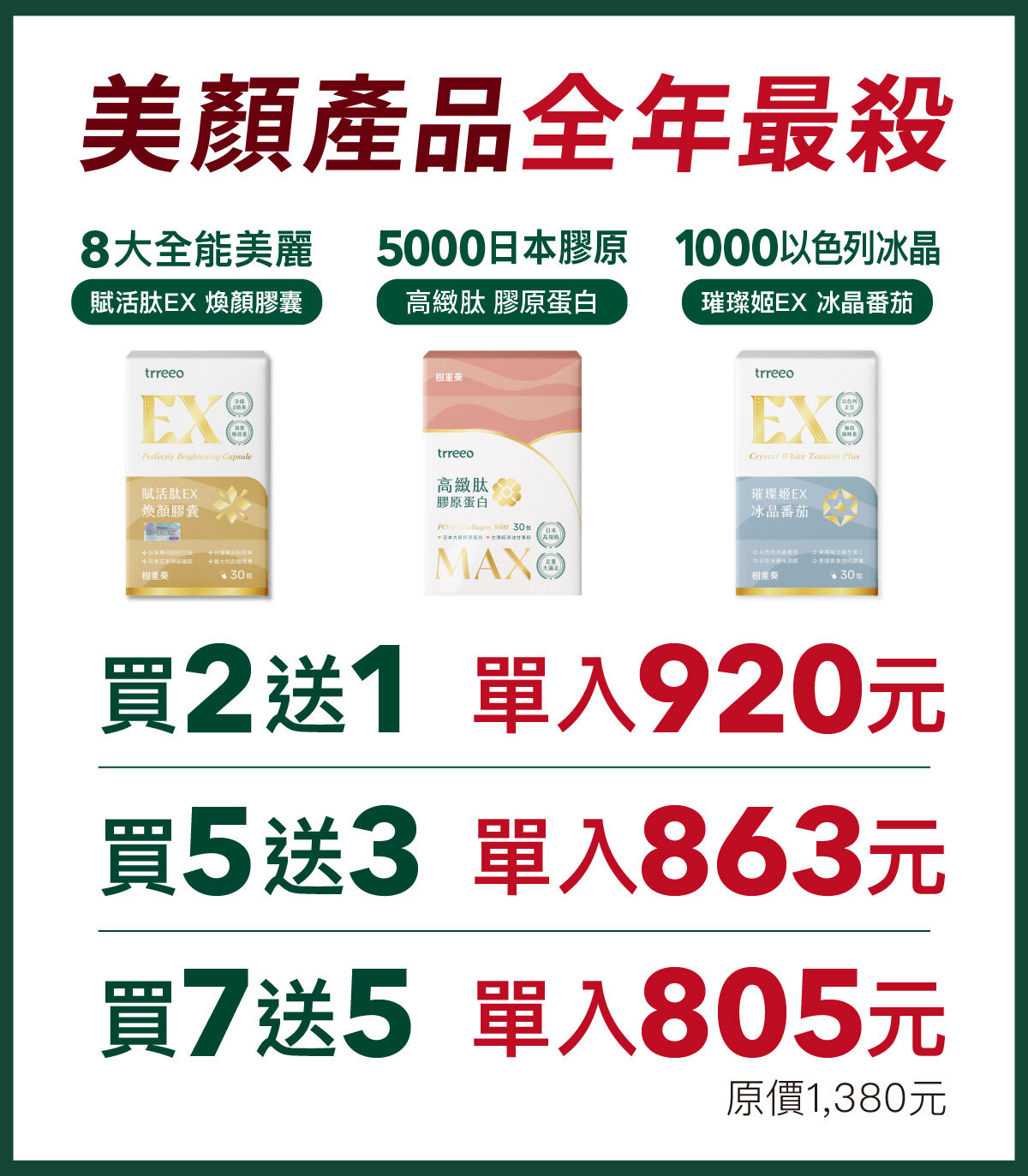 美顏三寶買2送1、買5送3、買7送5,等於你只用花7盒的錢,就可以帶走一年份的膠原蛋白產品,重點滿額還會再送!還有像冰晶番茄這種外面超貴的產品,這檔活動下殺平均一盒只要805元,真的要趁機會買!