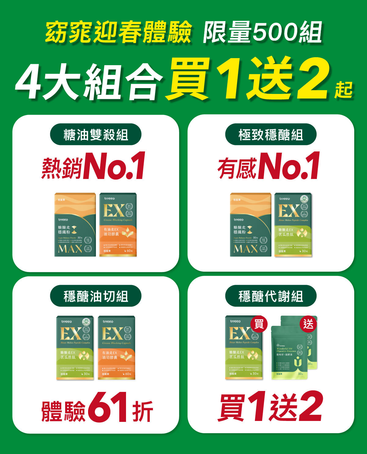 您如果剛認識樹重奏,或是想體驗美顏三寶以外的其他產品,我們也提供了12種超禮遇的體驗組合,有買1送1、加1元多一件等方案,其中不乏糖醣走、有油走、苦瓜胜肽、蔓越莓、海藻鈣等熱門商品!