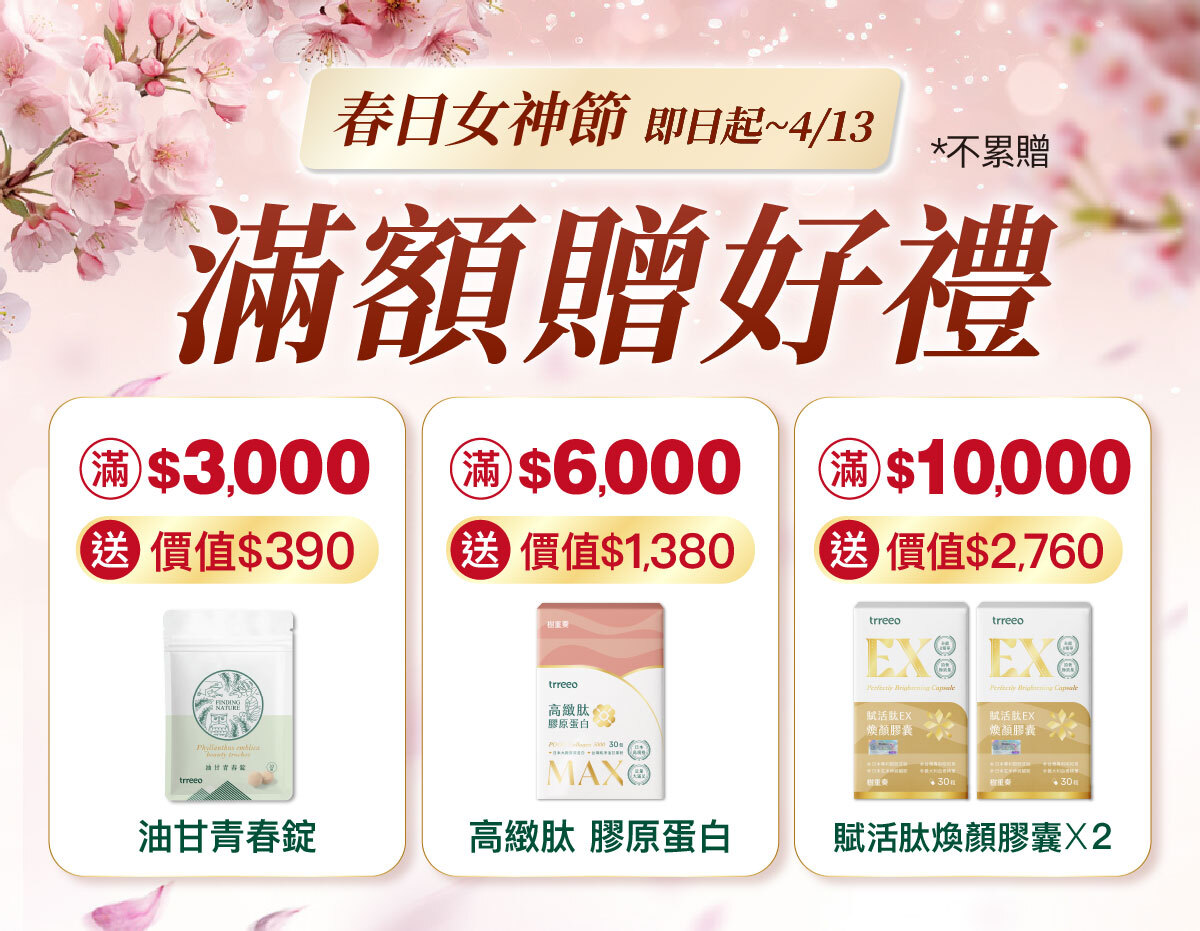 凡購物滿3,000元就送好禮,送青春錠、膠原蛋白、全能賦活肽等青春美麗好禮,最高送你價值2,760元好禮,追求全能煥顏的你,千位不能錯過這檔!