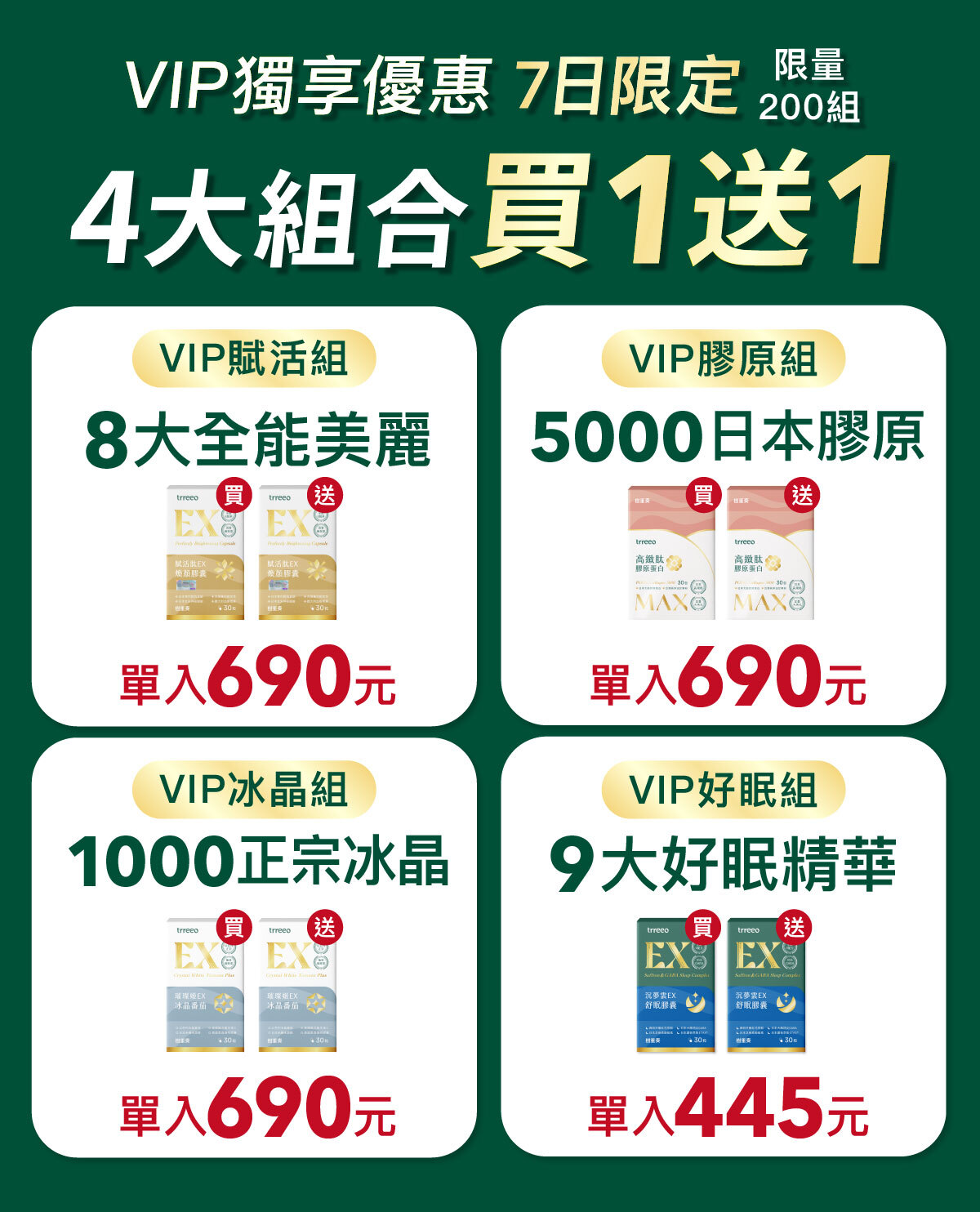 樹重奏寵粉無極限,這檔美顏活動直接讓我們VIP的會員開心買!除了多入組有全年最殺優惠外,如果您是VIP,您還有4種買1送1的好康可以買!