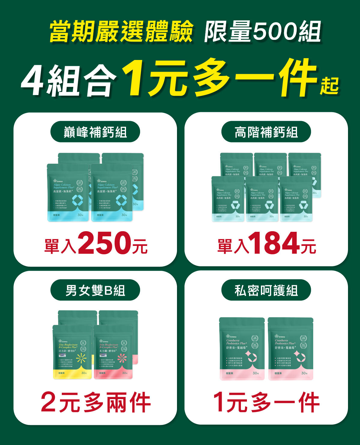 除了外在美,內在美也相當的重要!有良好的基礎健康狀態,才會由內而外的綻放自信光彩!所以,這檔的體驗組有穩固健康的雙海藻鈣、活力美力的補鋅補鐵酵母B群,以及超高規的蔓越莓,用超友善的加1元多一件等方案分享給您!
