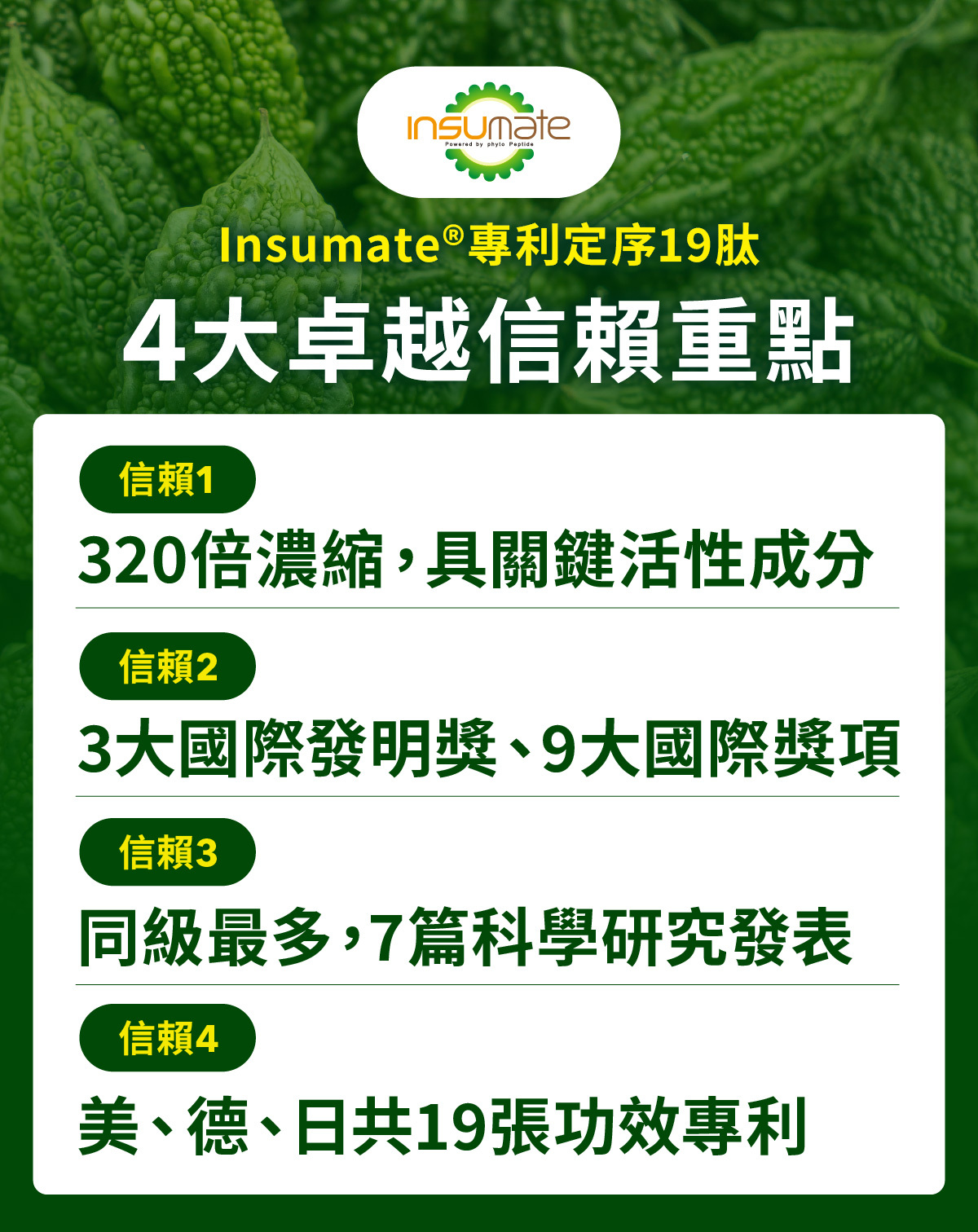 具有美、英、法、德、義、瑞、日等先進國家專利共19張,包含了三種不同類別的功效專利,此數量為同級苦瓜胜肽原料之最。故市售標榜美國苦瓜胜肽、德國苦瓜胜肽等的高規苦瓜胜肽產品,多有添加此Insumate®專利定序19肽。