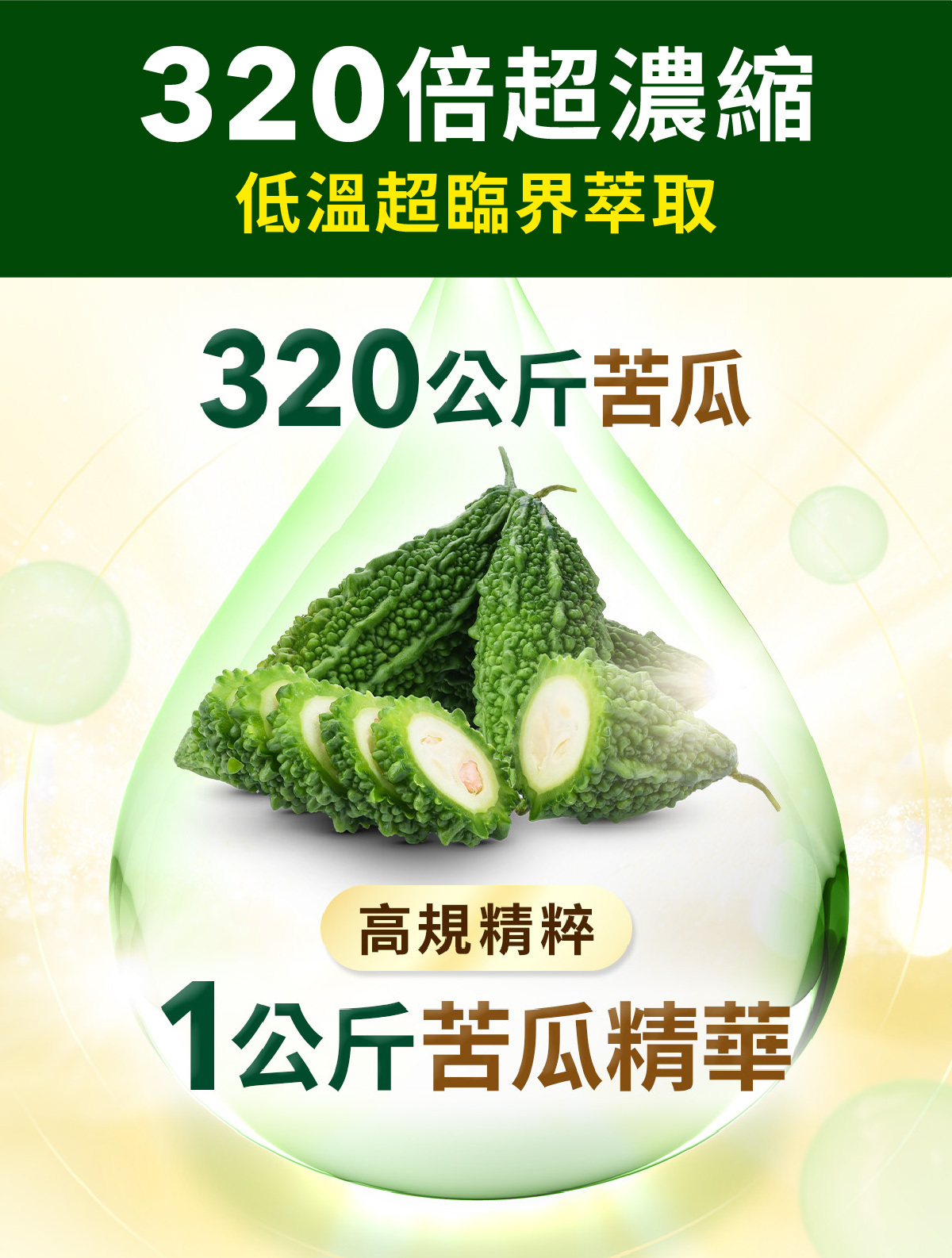 一般苦瓜粉與苦瓜萃取精華,關鍵成分差很大,故綜效能力差距也大。以Insumate®專利定序19肽來看,使用320倍的超高倍濃縮,並全程使用低溫超臨界萃取,以維持關鍵成分的品質與活性。等於320公斤的苦瓜,才能提取出1公斤的Insumate®苦瓜精華。