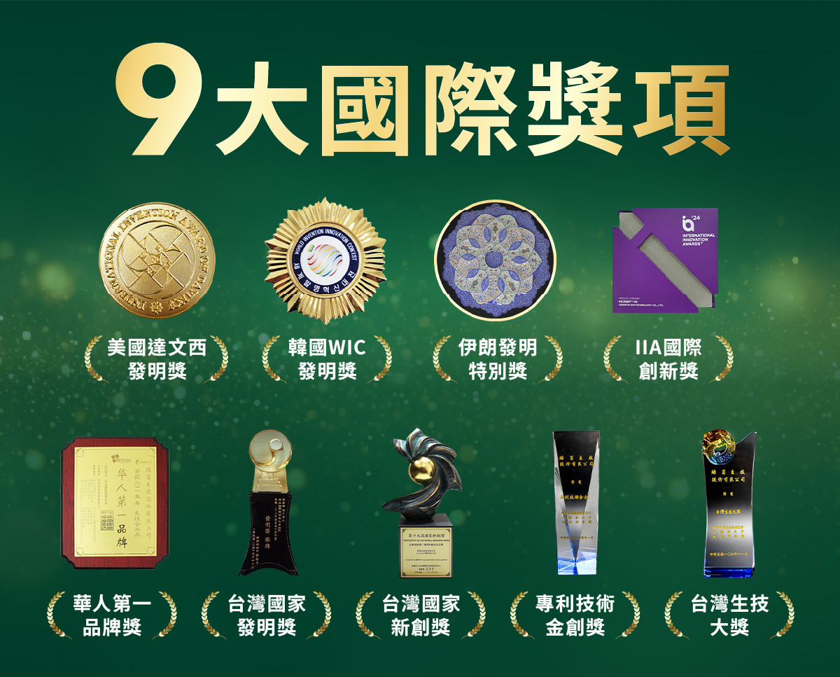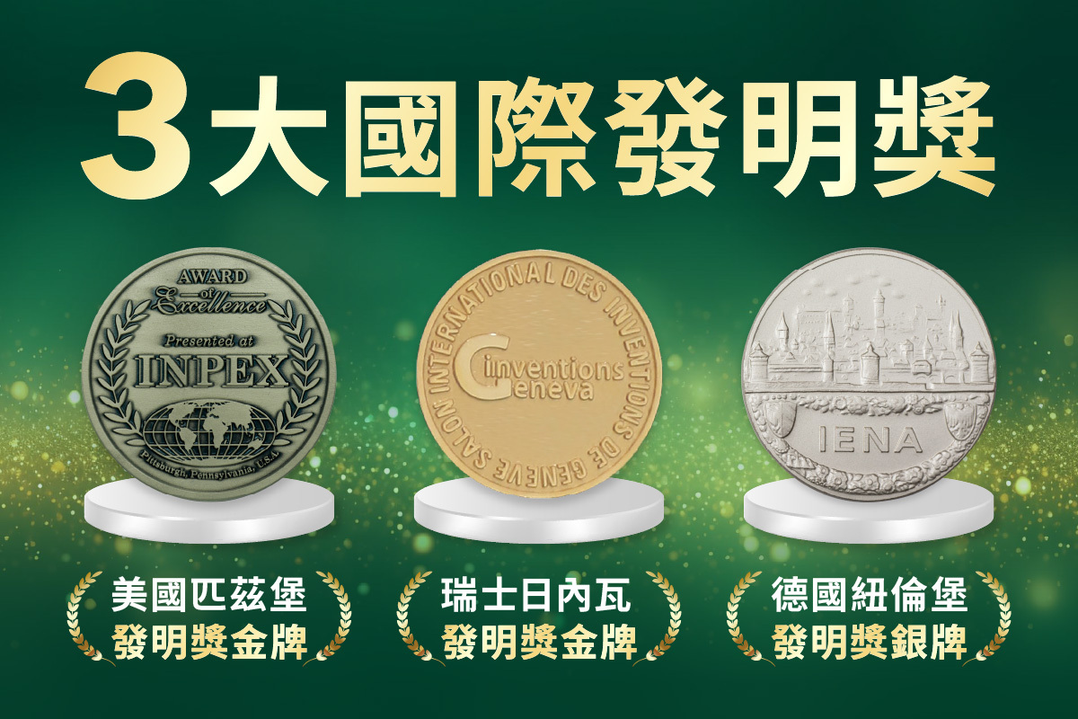 除了3大發明獎外,還一舉斬獲美國達文西發明獎、韓國WIC發明獎、伊朗發明特別獎、IIA國際創新獎、華人第一品牌獎、台灣國家發明獎、台灣國家新創獎、專利技術金創獎、台灣生技大獎等9大獎項。