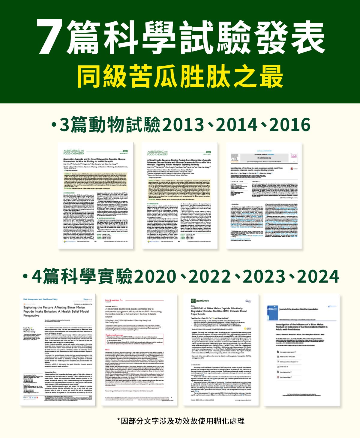Insumate®專利定序19肽具有7篇科學試驗,為同級苦瓜胜肽原料之最。其中2013年到2016年間先從動物試驗開始,發表3篇文獻於知名期刊。2020年到2024年間,更發表了4篇臨床研究,其中更包含了台灣醫學中心、美國與韓國先進國家的高規格試驗成果。