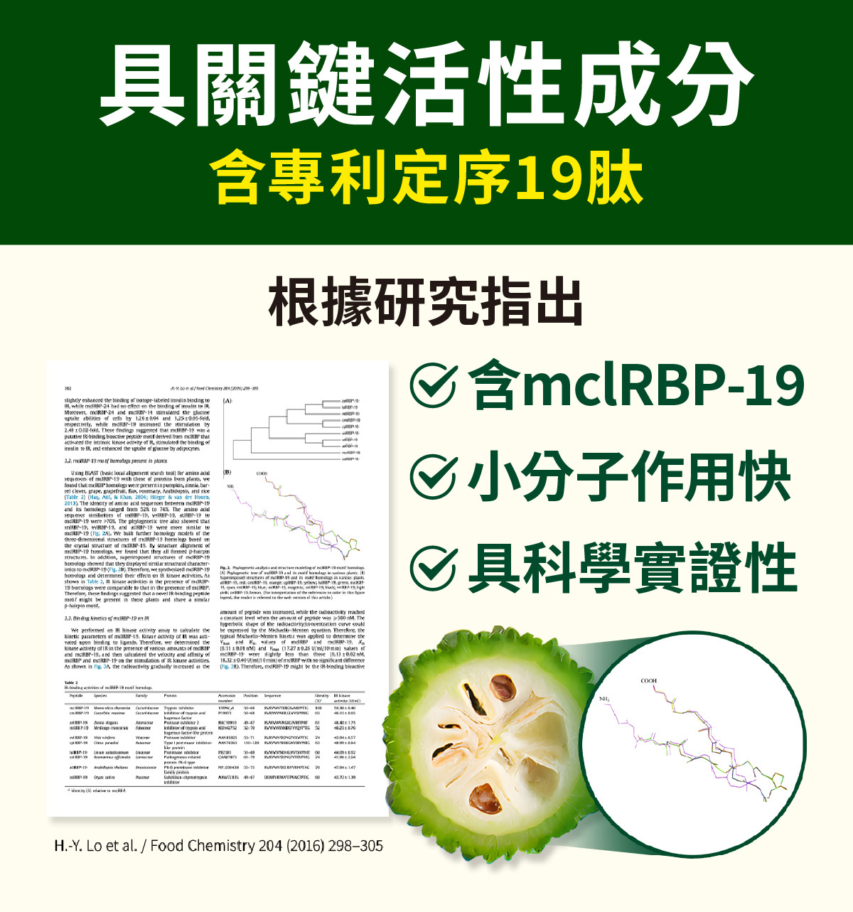 Insumate®苦瓜萃取物具有專利定序19肽,為單一活性成分,經分析為mclRBP-19,分子量僅2162.71Da。因為分子量小,且結構具備專一性,根據研究指出具有穩定代謝、健康維持的助益。