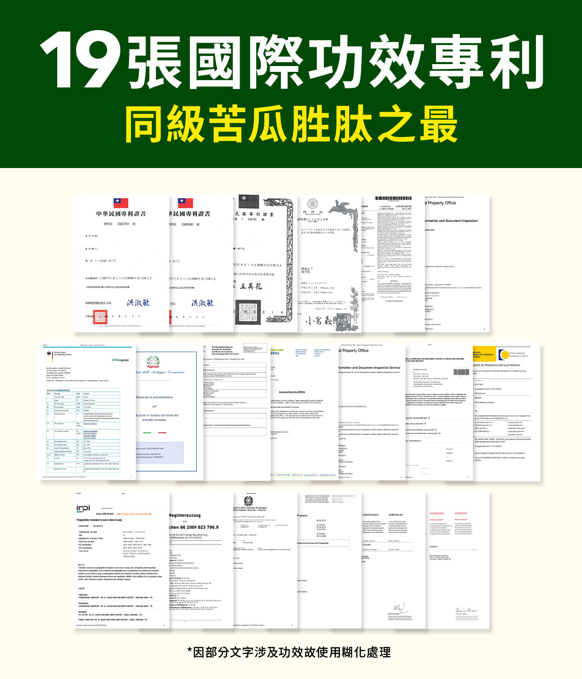 擁有美、英、法、德、義、瑞、日等先進國家專利共19張,為苦瓜胜肽原料之最!故此原料也常稱美國、德國專利苦瓜胜肽,具有多國專利,代表技術效能卓越,且國際佈局廣,外銷多國信賴度高!