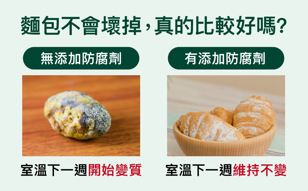 試想,麵包放在室溫下一週,都不會壞掉或發霉,那可能要擔心是否添加過多防腐劑或人工成分。其實,保健食品也是一樣的概念。