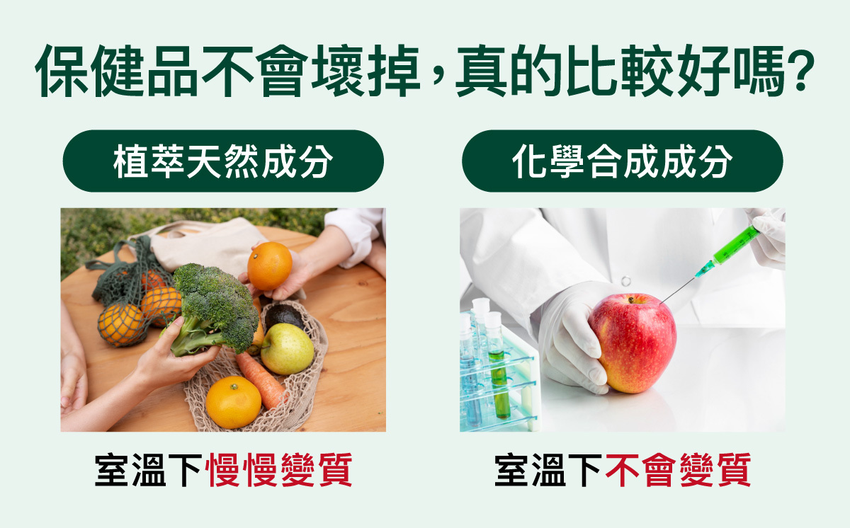 新鮮的水果放在室溫下很快就會壞掉,但泡了防腐物質的水果蜜餞,保存期限卻可以長達一年之久。相對於植萃天然的保健品,化學合成的營養成分擁有更不容易壞掉的優點。