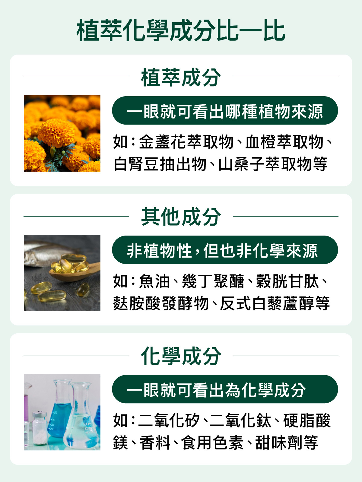請翻到產品包裝的背面,看全成分內容。以葉黃素來說,主要為金盞花萃取物,藻紅素來說,主要為紅藻萃取物,只要成分中看起來為植物的,就是植萃來源的成分。