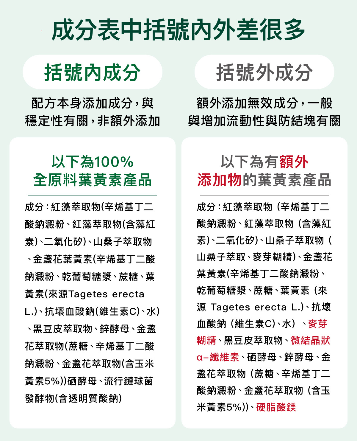 全成分中,可能有些配方成分後具括號,「括號內」可能會有麥芽糊精、二氧化矽等成分,其實不用太過擔心,括號內的成分多半與原料穩定性有關,且添加量一般不高,並非充數用額外添加。