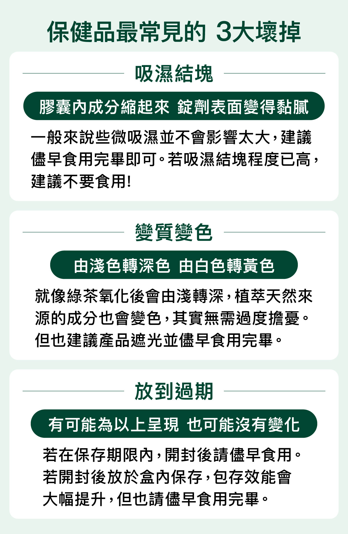 故產品開封後最常遭遇到的問題,就是乾燥粉狀的膠囊、錠劑、粉包產品吸濕而結塊。若您的產品屬植萃成分含量高的,建議開封後請儘早食用完畢。