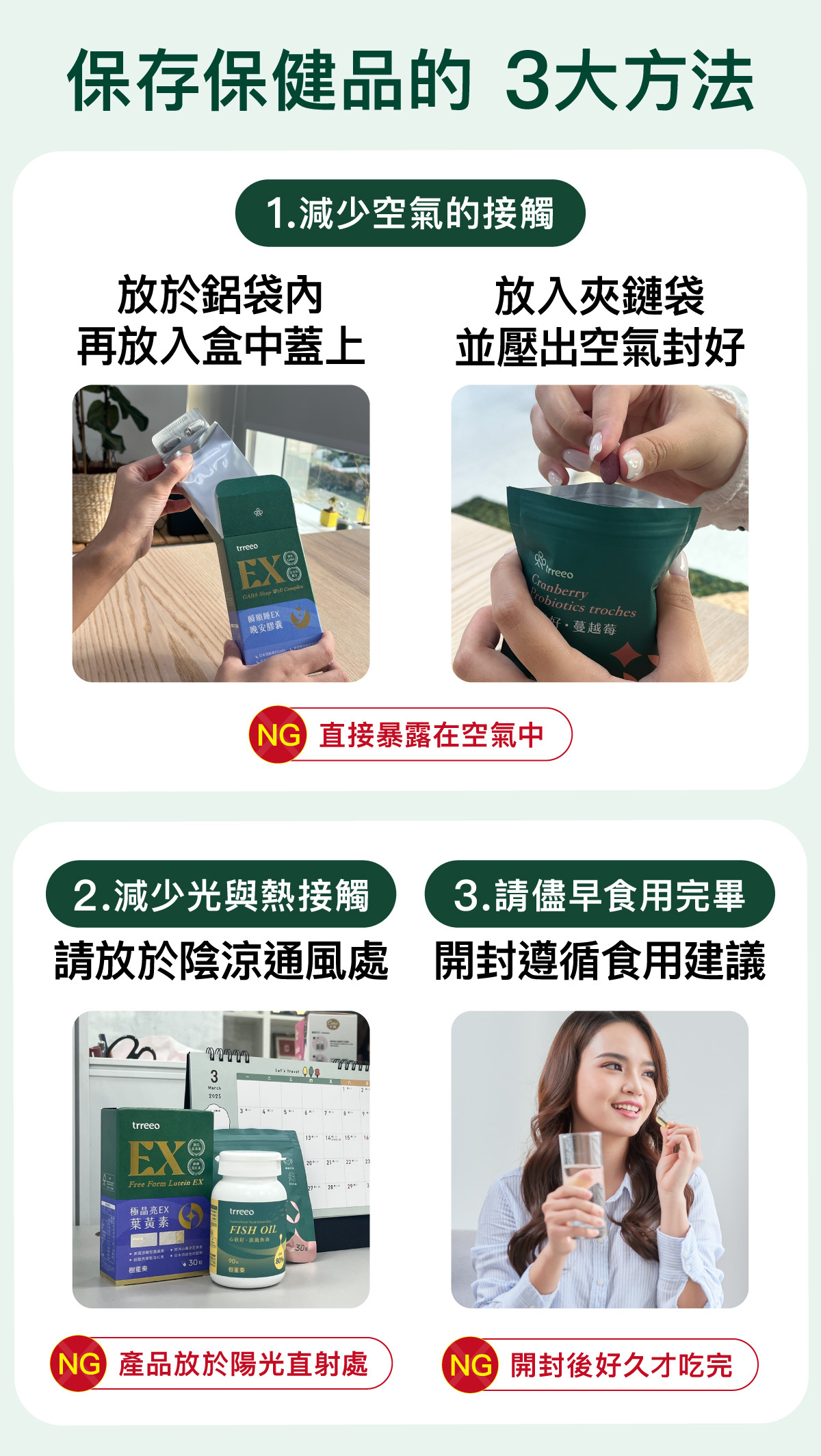 植萃保健品雖然是變成比較像藥品的膠囊、錠劑形式,但本質上它還是食品,它怕濕、怕光、怕熱。所以開封後請記得封好包裝,保存在乾燥、陰涼的地方。