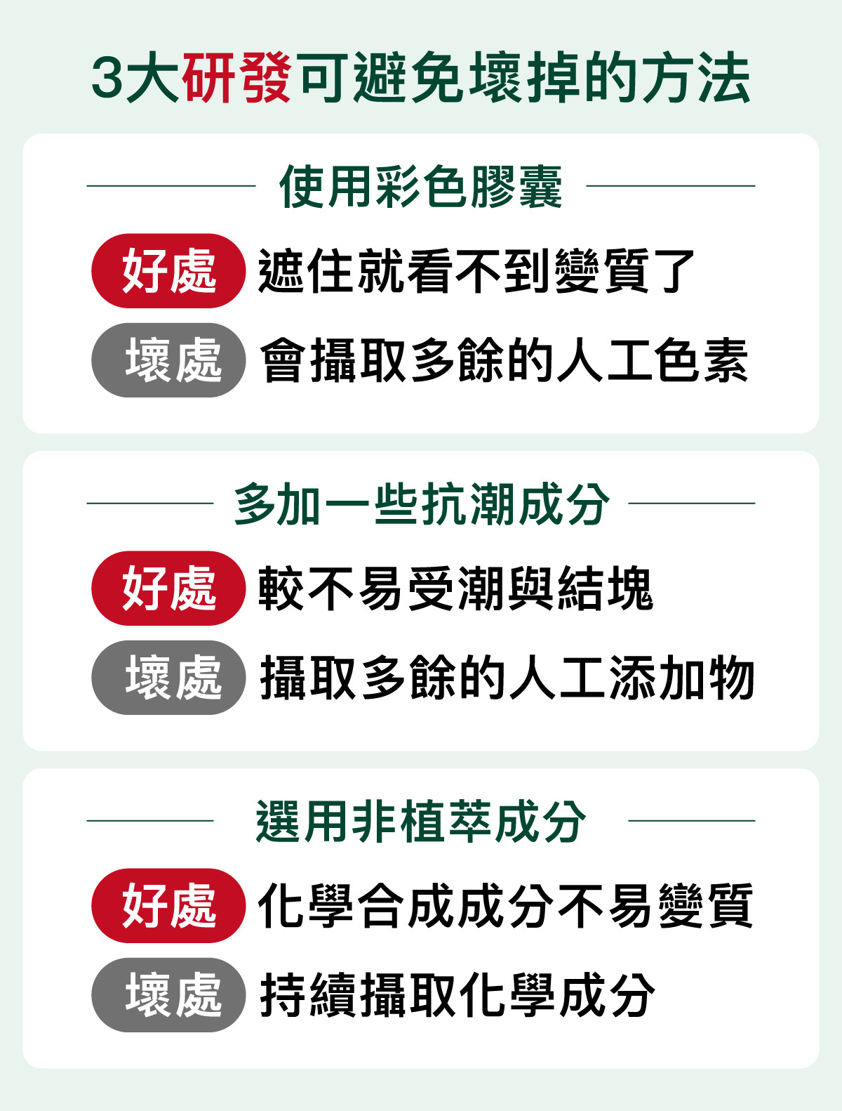 謝謝您看到了這邊,其實要做不容易「壞掉」的產品,比容易「壞掉」的簡單許多,因為只要用有色膠囊、多充填人工抗潮成分、並多選用化學合成成分,您的保健品,就真的比較不容易壞掉。