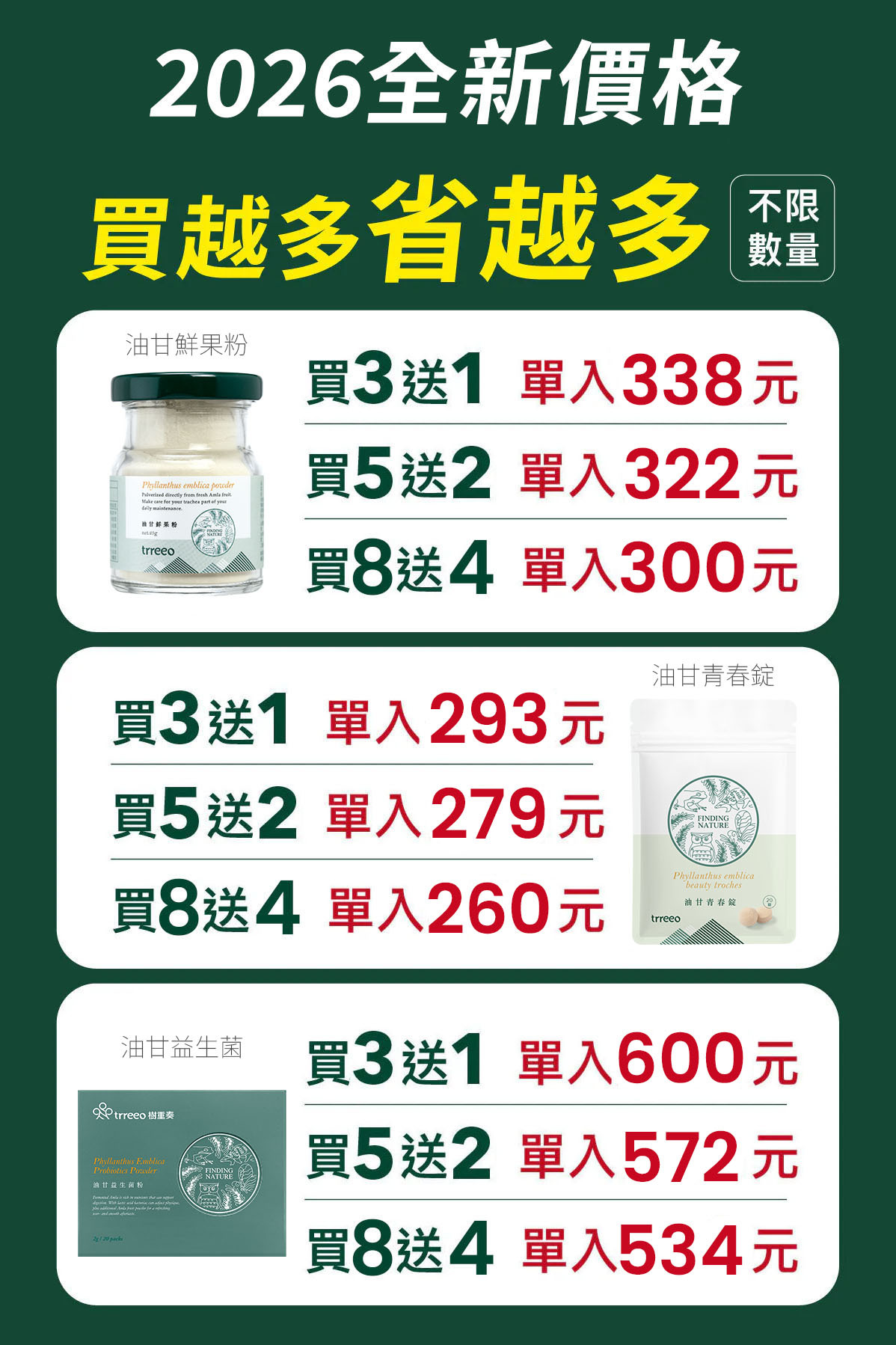 樹重奏針對大家不同的食用方式需求,提供3款油甘商品,並用260元起,買3送1、買5送2、買8送4的最優惠價格回饋給您!挺您青春美麗、調整體質、病後補養!想暸解更多優惠內容,請往下看!
