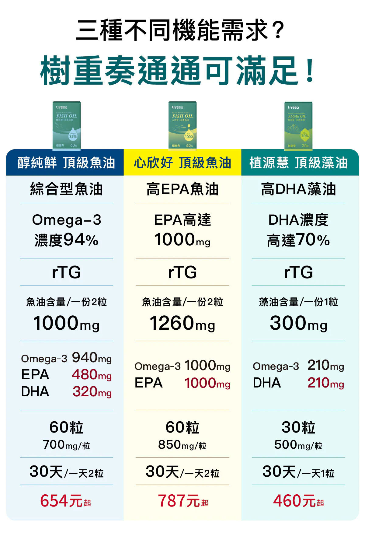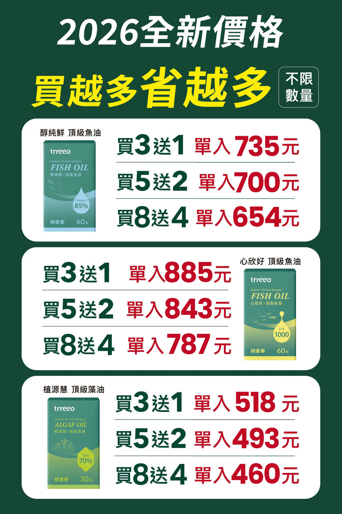 樹重奏針對3種不同需求,提供3款高濃度的魚油、藻油,並用460元起,買3送1、買5送2、買8送4的全新價格回饋給您!想立即購買優惠,請點網址!