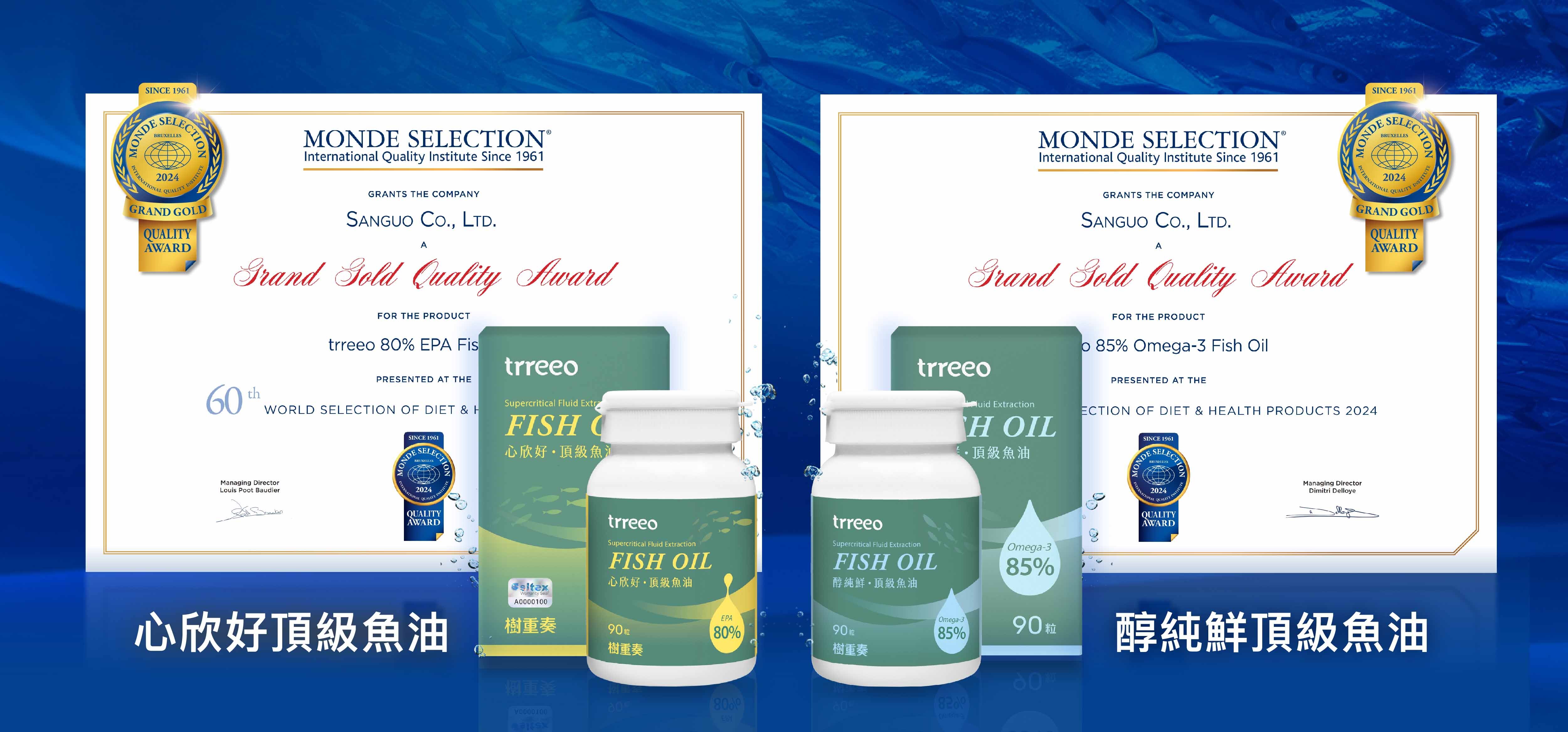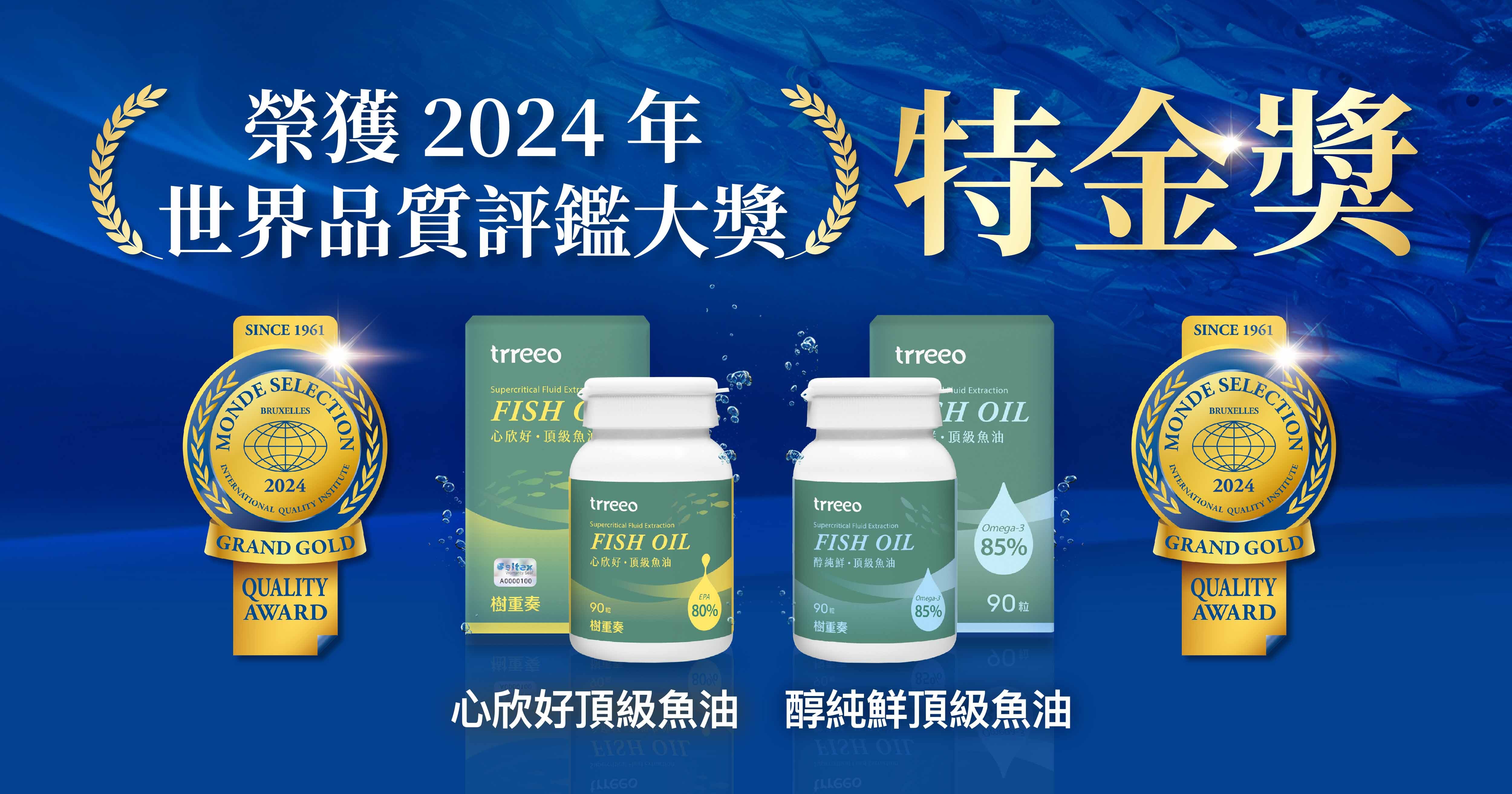樹重奏醇純鮮頂級魚油、心欣好頂級魚油兩款魚油,在Monde Selection世界品質評鑑大賞中脫穎而出,首次參賽即榮獲「雙特金獎」肯定,在總項目中,共獲得多達6項100分滿分。