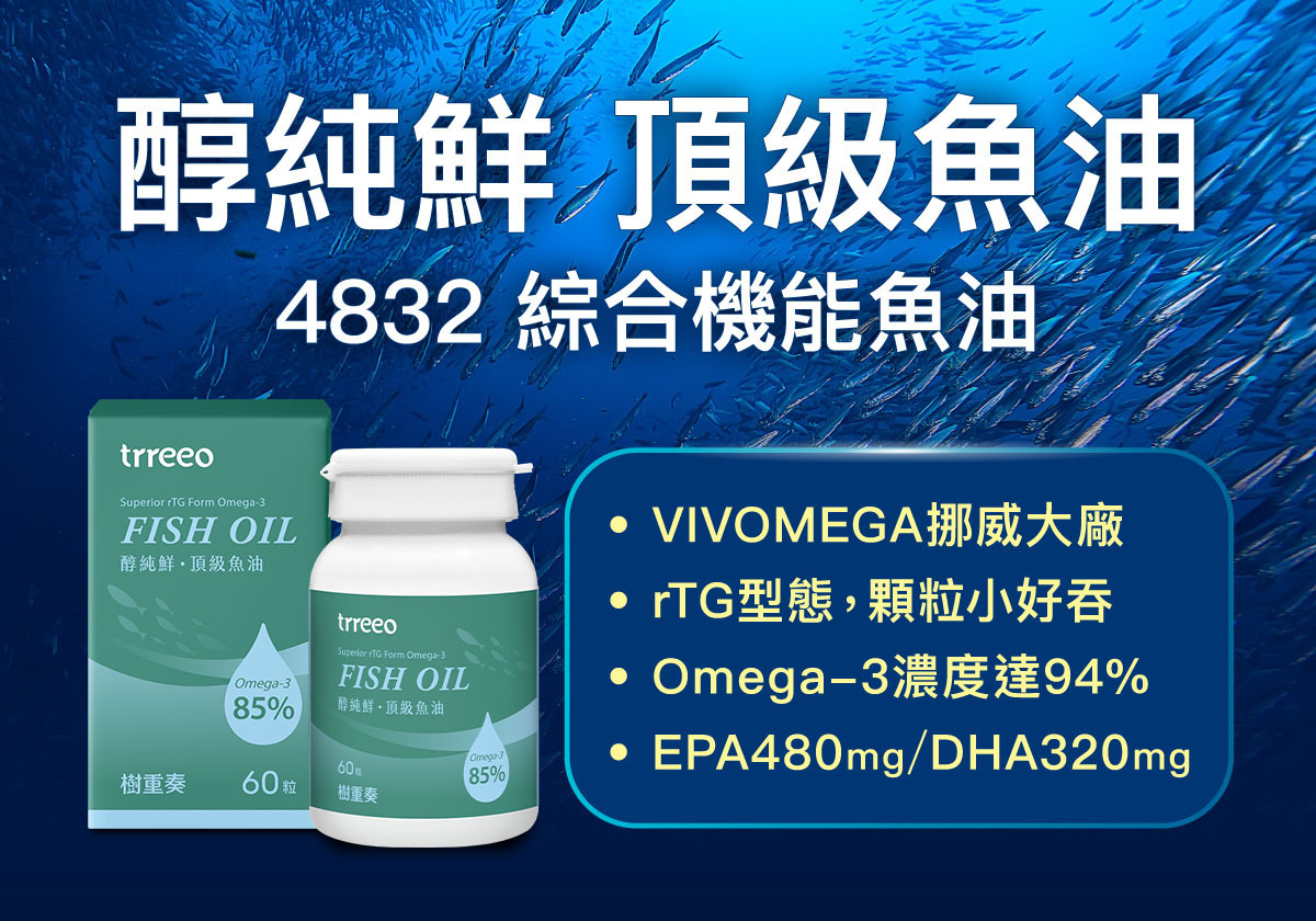 主流綜合型魚油多為4832規格,也就是48%為EPA、32%為DHA,以rTG型態的高效小顆粒型態為趨勢,一天2粒即可達標。這種魚油適合全家大小食用。