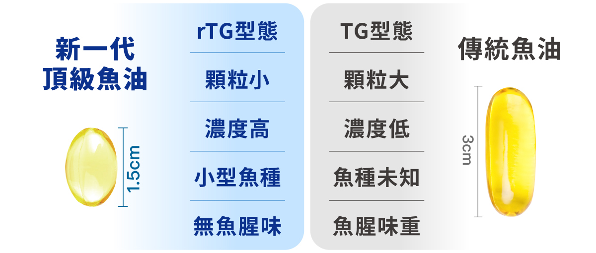 rTG型態為高濃度機能油的代名詞,具備高濃度、高吸收率、低腥味的多重優點。現在主流小顆粒好吞、效能高的魚藻油,多為rTG型態,因技術門檻高,較前兩者昂貴。