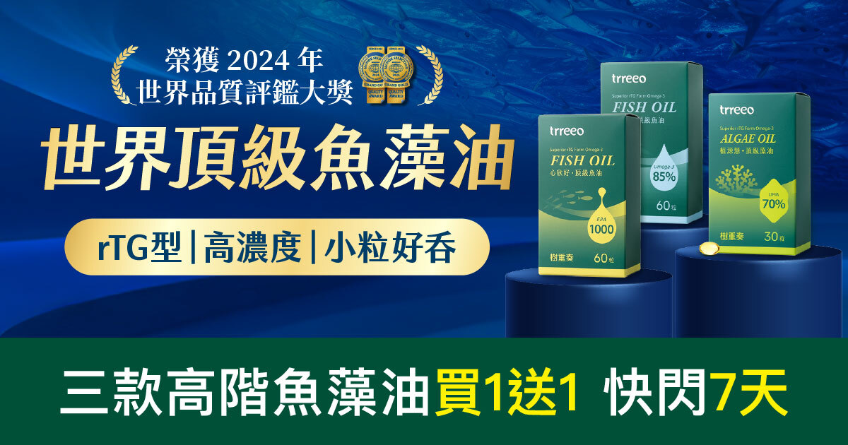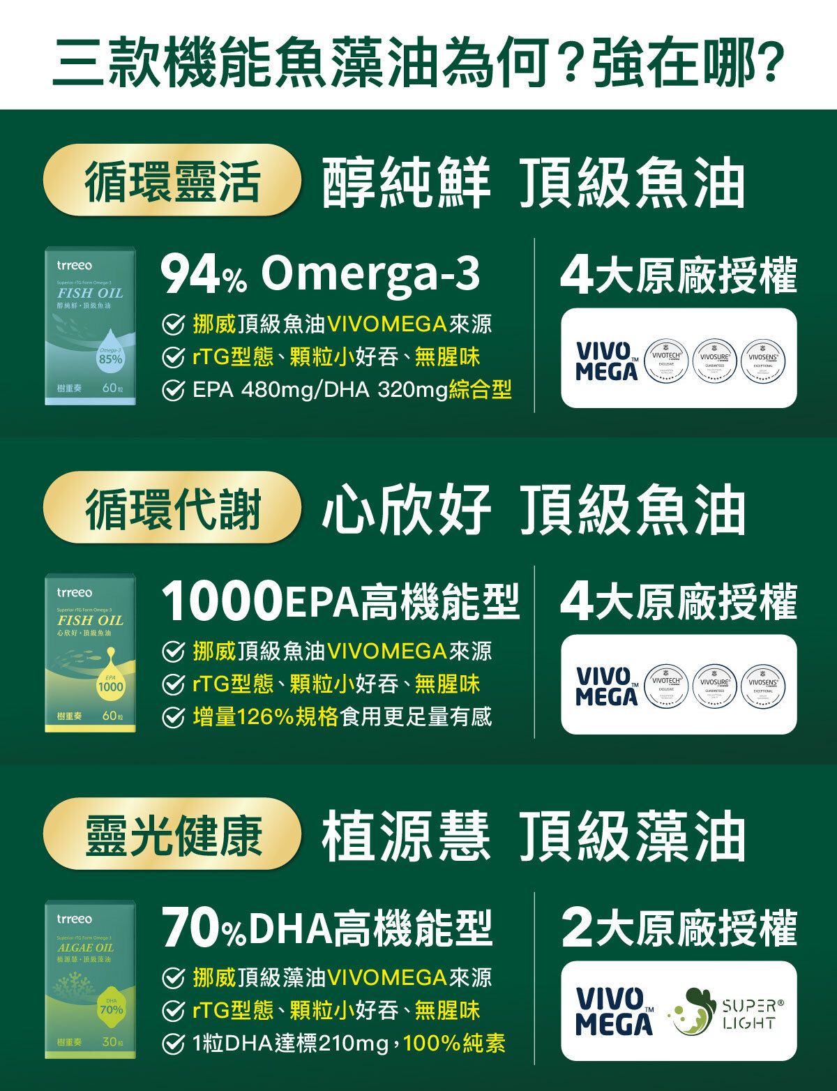 樹重奏的三款機能魚藻油,皆來自挪威VIVOMEGA,嚴選最高規格,如果您有在吃綜合型魚油、EPA機能魚油、DHA純素藻油,現在買1送1只有7天!優惠請往下看!