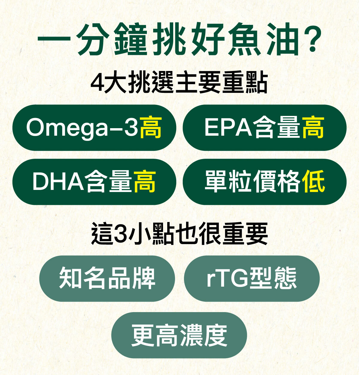 4大重點為Omega-3、EPA、DHA的含量與價格。前三者的數值越高越好,因為花錢吃的就是這三個營養素,價格則越友善越好。