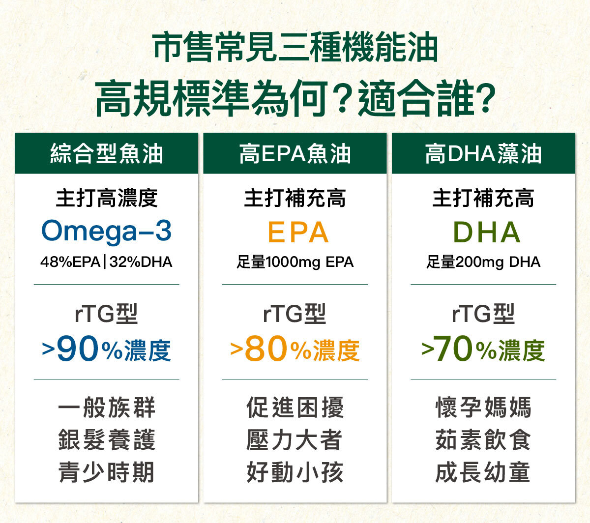 3個不可小看的重點是品牌、濃度與型態。舉例來說挪威VIVOMEGA、德國KD都是知名品牌,製造品質卓越。綜合型魚油選濃度90%以上、藻油選濃度70%以上為尤佳。型態則是rTG為趨勢,因為具有超高濃度、高吸收率的多重優點。