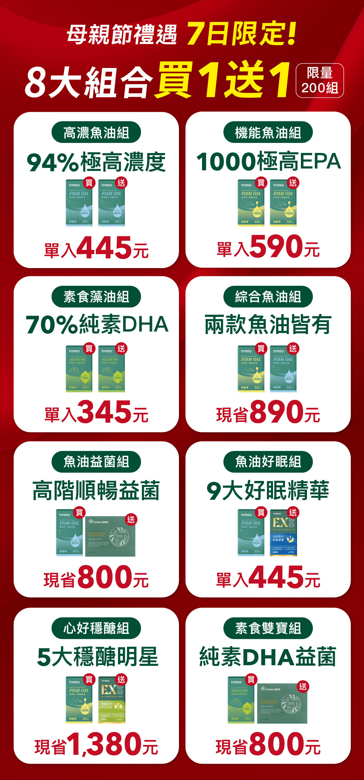 歡慶母親節活動上線,首7日獻上超禮遇買1送1方案!除了三款高階魚藻油外,再送油甘益生菌、沉夢雲舒眠膠囊、糖醣走苦瓜胜肽等好禮,限量200組,活動只到4/27的23:59,送完為止敬請把握!