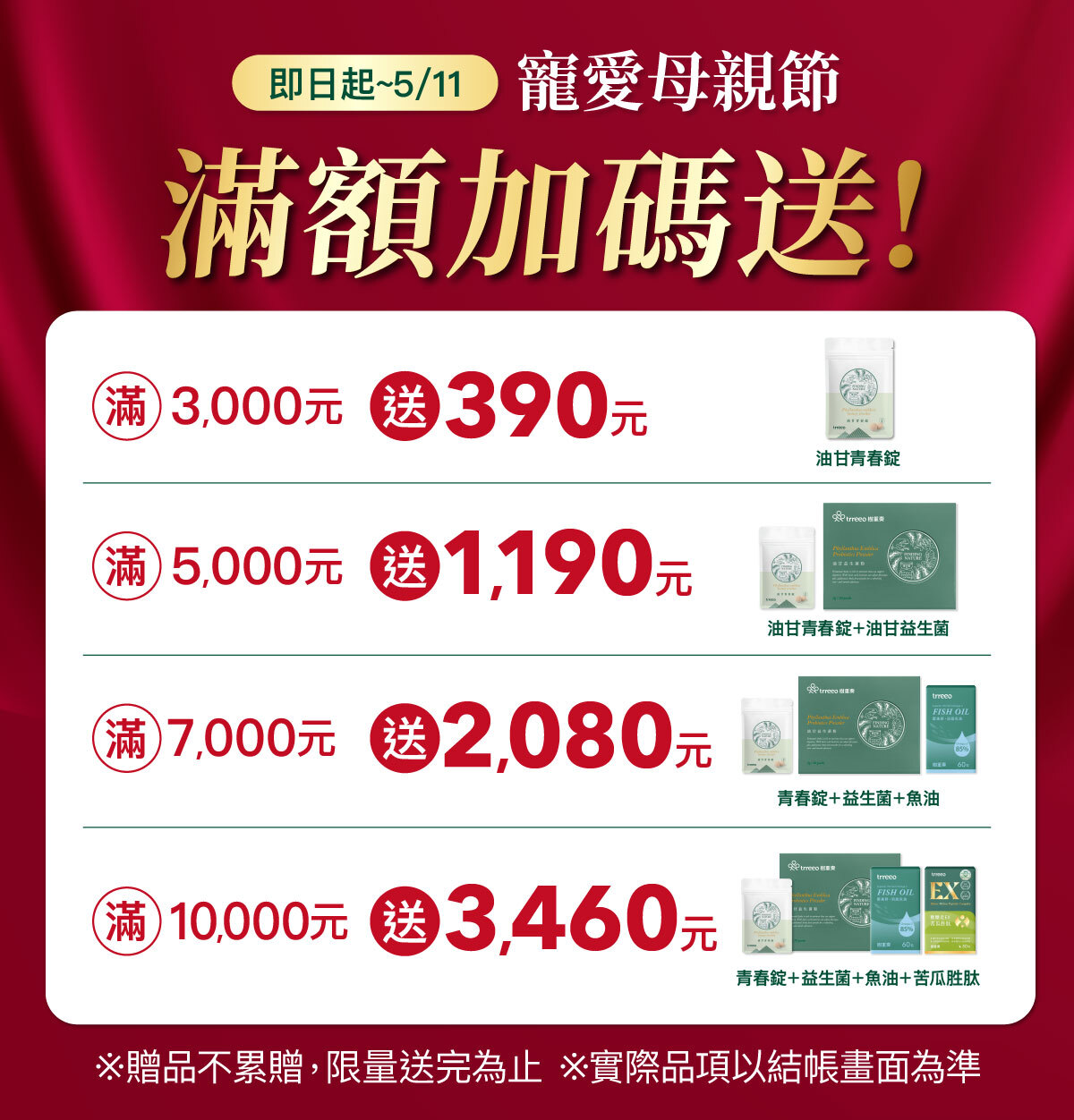 再加送調整體質、排便順暢、抗氧青春三合一油甘益生菌價值800元,累積好禮價值達1,190元。