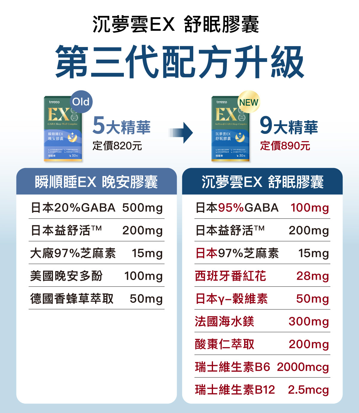 過往GABA原料多為20%,以添加500mg為「業界最高」。樹重奏第二代的產品,就以日本第一的PharmaGABA添加達500mg業界最高為賣點。第三代我們拿到5倍高濃度的95%(實際近100%)新規格,並添加100mg同樣達業界最高。雖然關鍵成分含量相當,但多出來的400mg空間,可以讓我們加入更多有感好料!