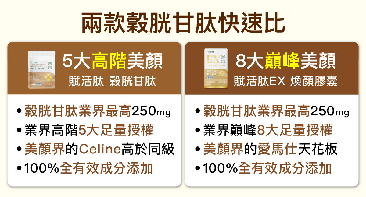 新上市的產品「賦活肽穀胱甘肽」和原本的「賦活肽EX煥顏膠囊」是姐妹產品,後者是業界美顏配方的天花板,前者也不遑多讓,讓我們快速來比較一下兩者差異。