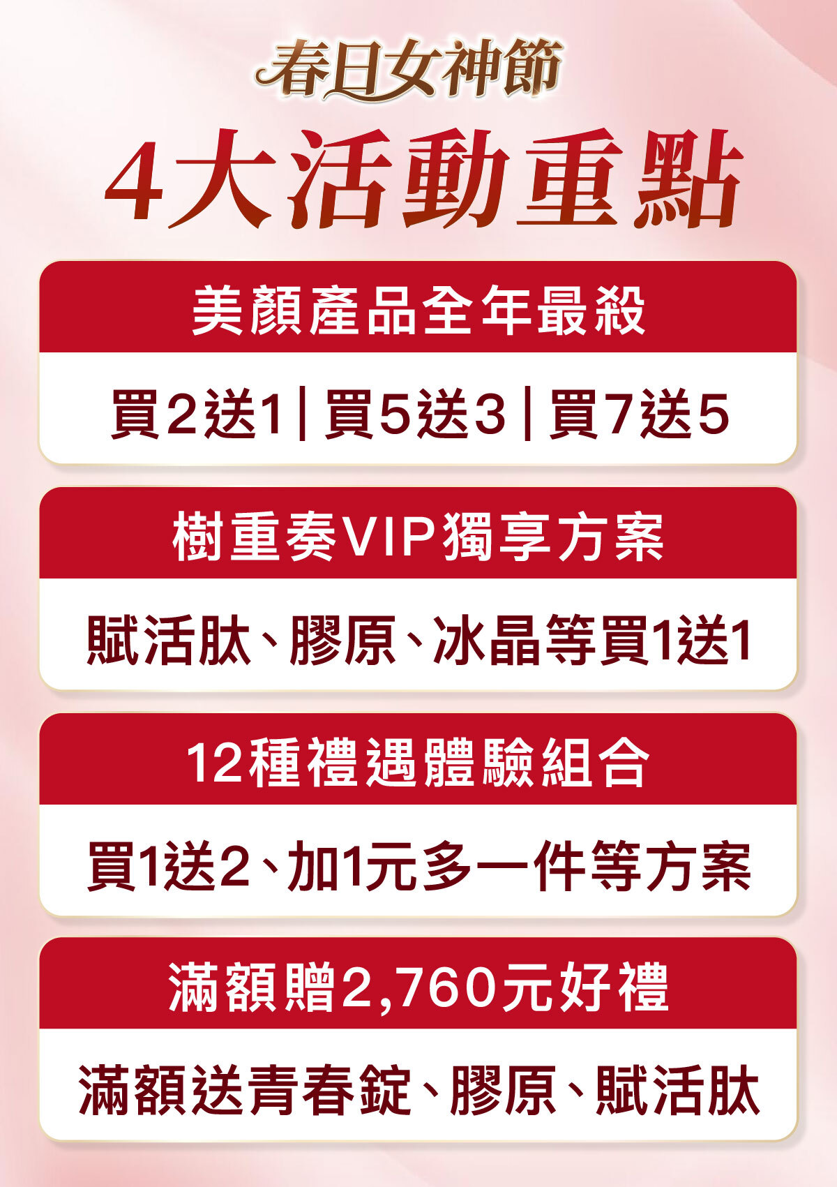 春日女神節以美顏產品為主軸,但也搭配了窈窕迎春的明星產品,還有女性很需要的蔓越莓和海藻鈣等,滿額再送妳膠原蛋白等好禮。共4大活動好康,以下帶您快速看!