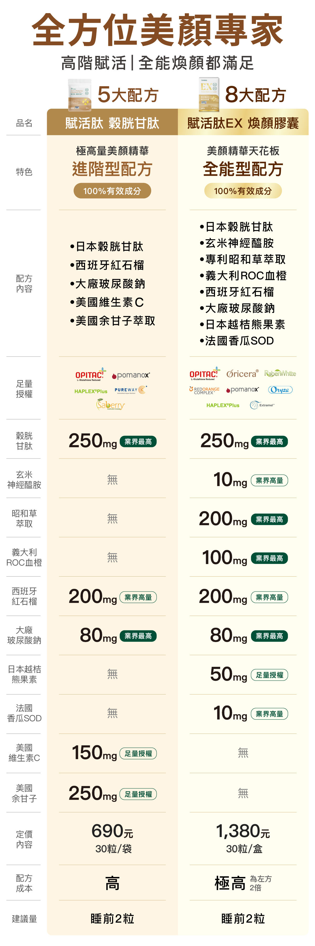 如果您要小編推薦,如果您追求極致美顏,有預算一定是選右邊啦!但左邊的也沒有不好,這樣的配方已經高於市售許多產品了,只賣690元挺你美麗價!