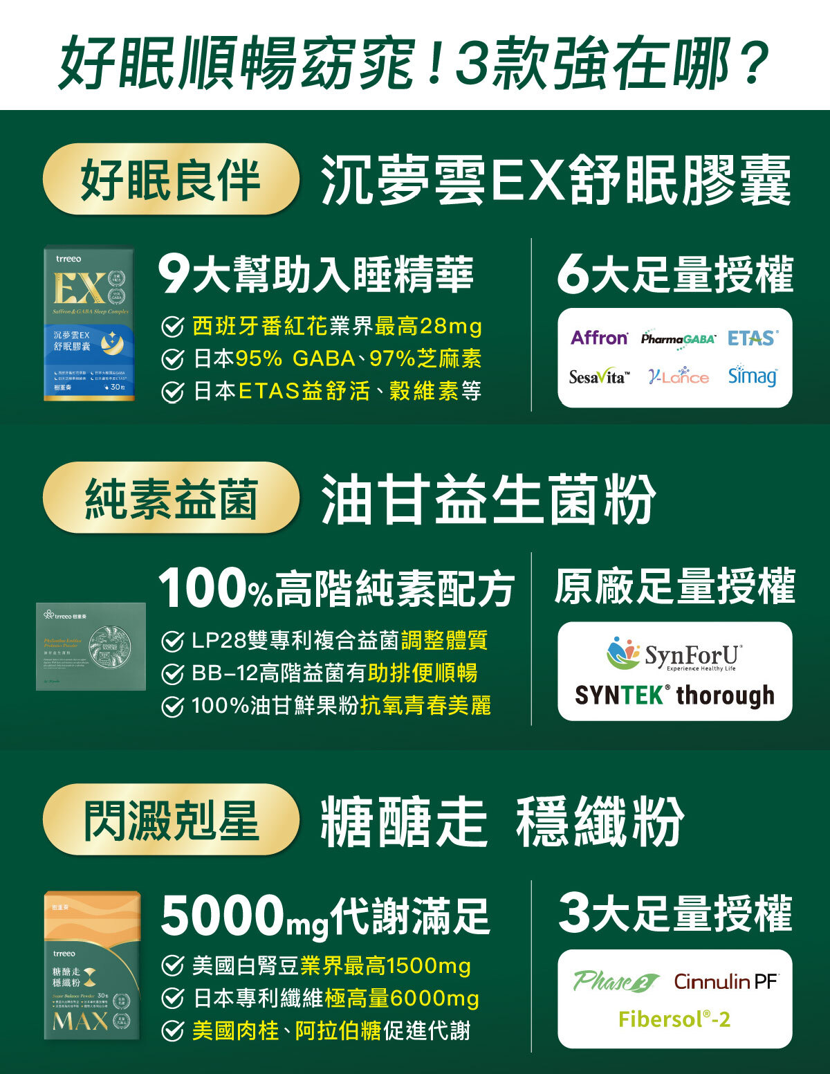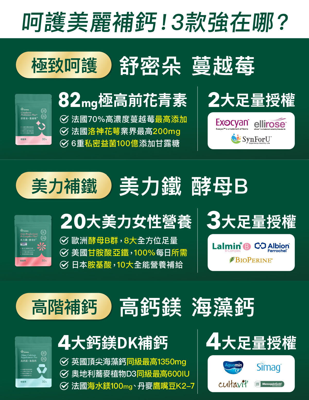 熟悉樹重奏的朋友就知道,新品上市我們還會再送數款熱銷品給大家,這檔有頂尖蔓越莓、補鐵酵母B群、高階海藻鈣、舒眠全明星、青春益生菌、日本膠原蛋白和熱銷No.1的糖醣走。